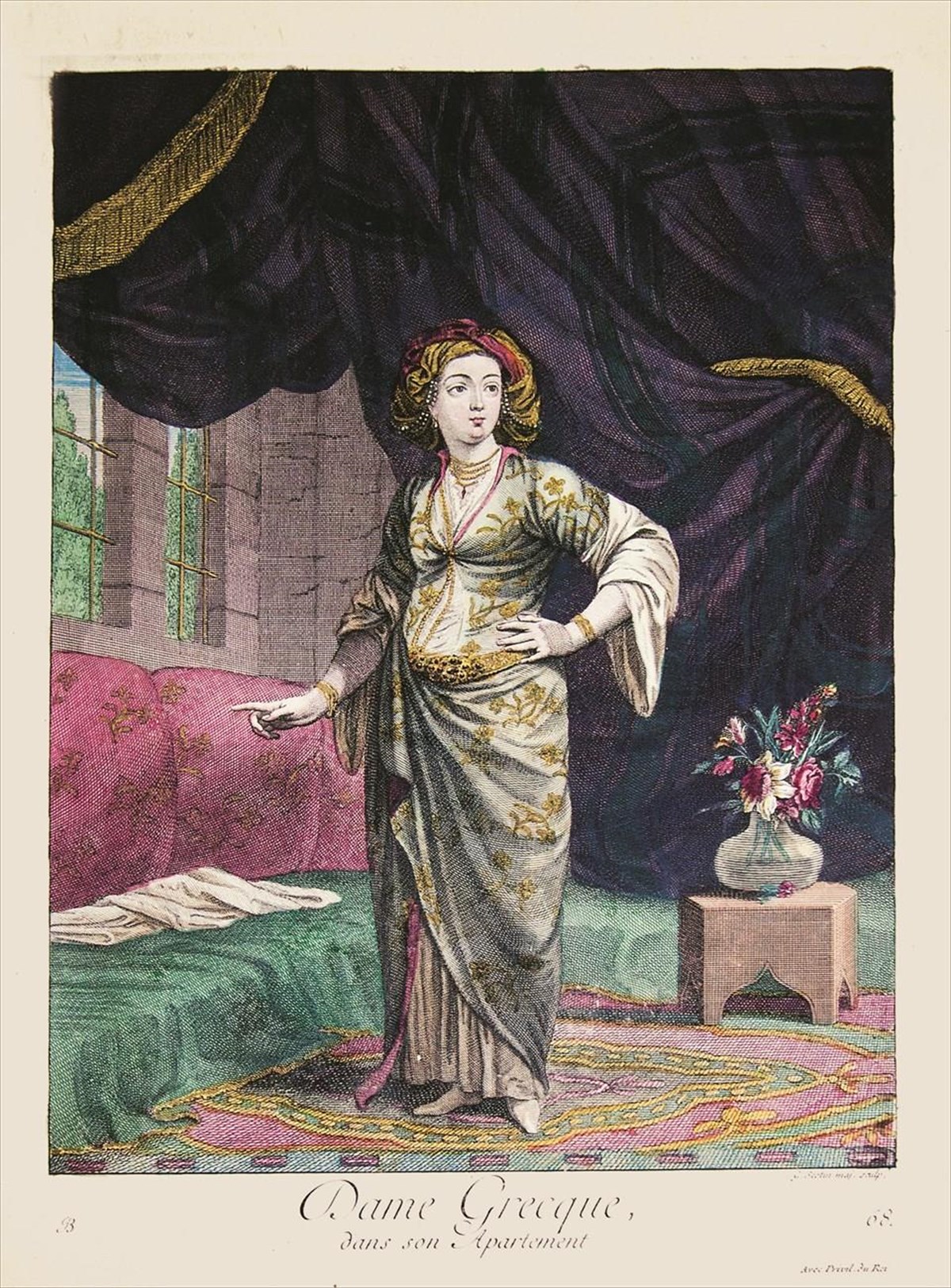 Ελληνίδα αστή στα διαμερίσματά της. Αποσπασμένη χαλκογραφία, σχέδιο του J.B. van Mour. Διακρίνονται ανάγλυφες χρυσίζουσες λεπτομέρειες στα κοσμήμτα και τη ζώνη. Charles de Ferriol, Recueil de cent estampes représentant differentes nations du Levant…, Chez Le Hay, Chez Duchange, Παρίσι 1714. Μουσείο Μπενάκη – Συλλογή Ευστάθιου Φινόπουλου.