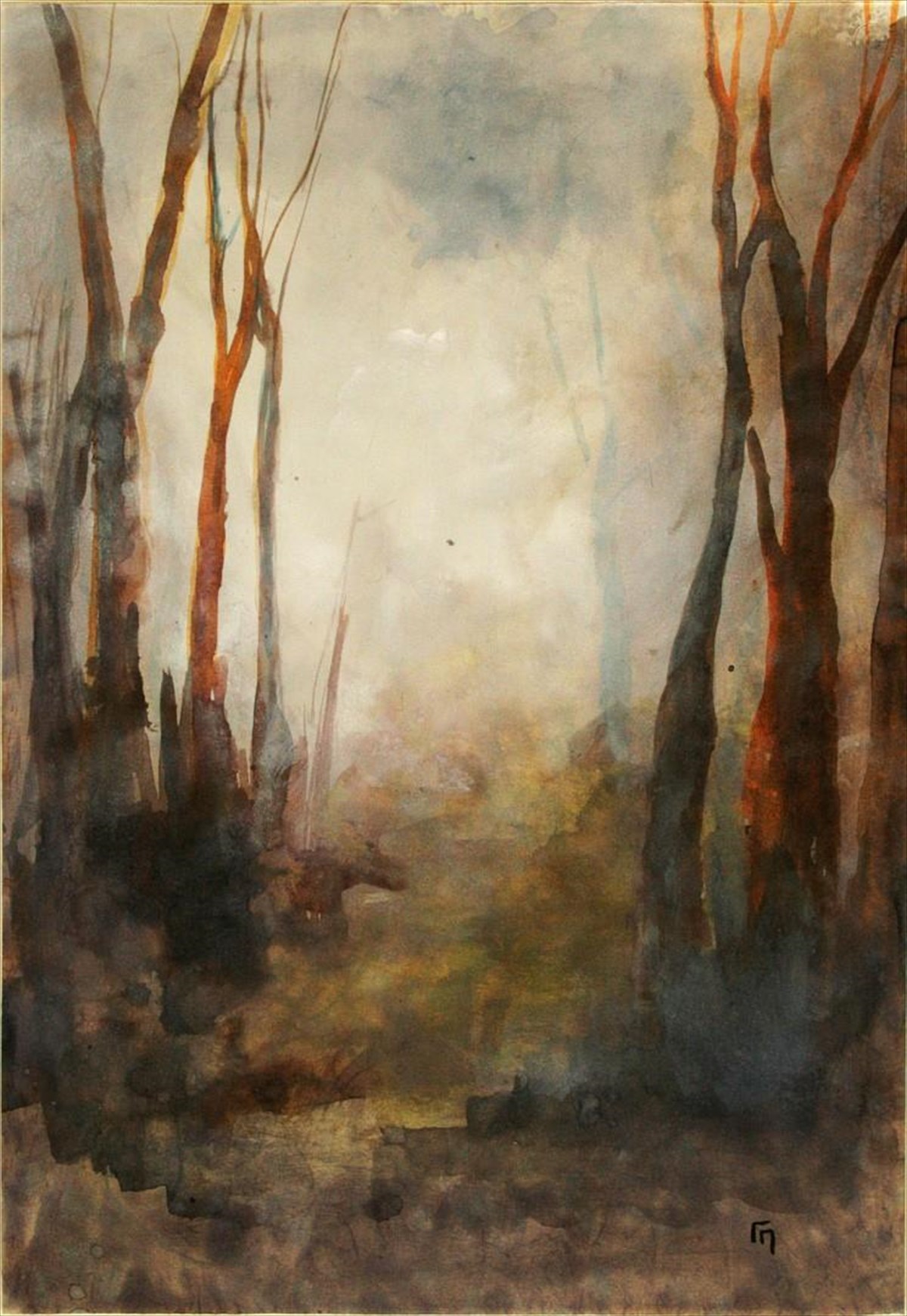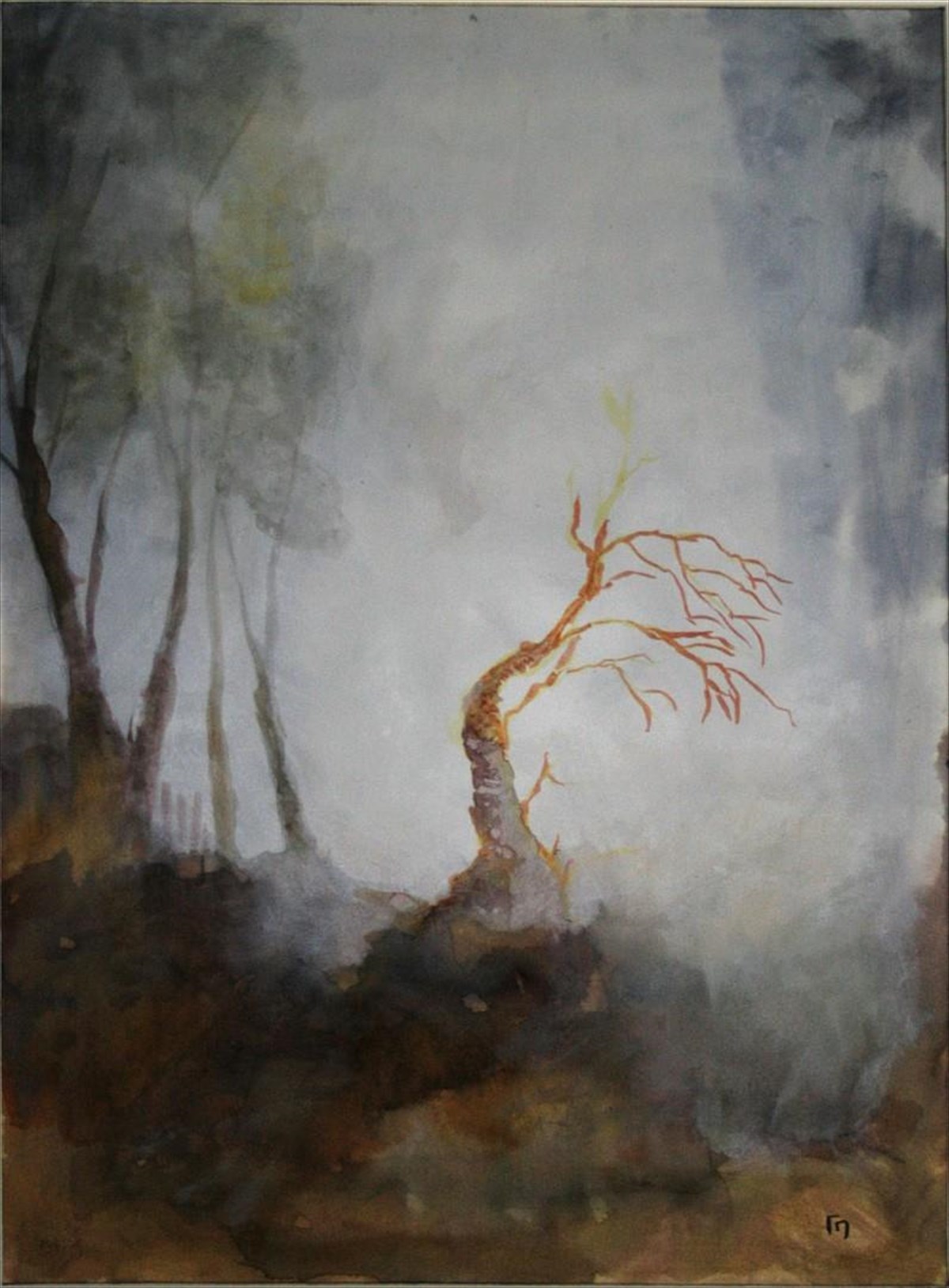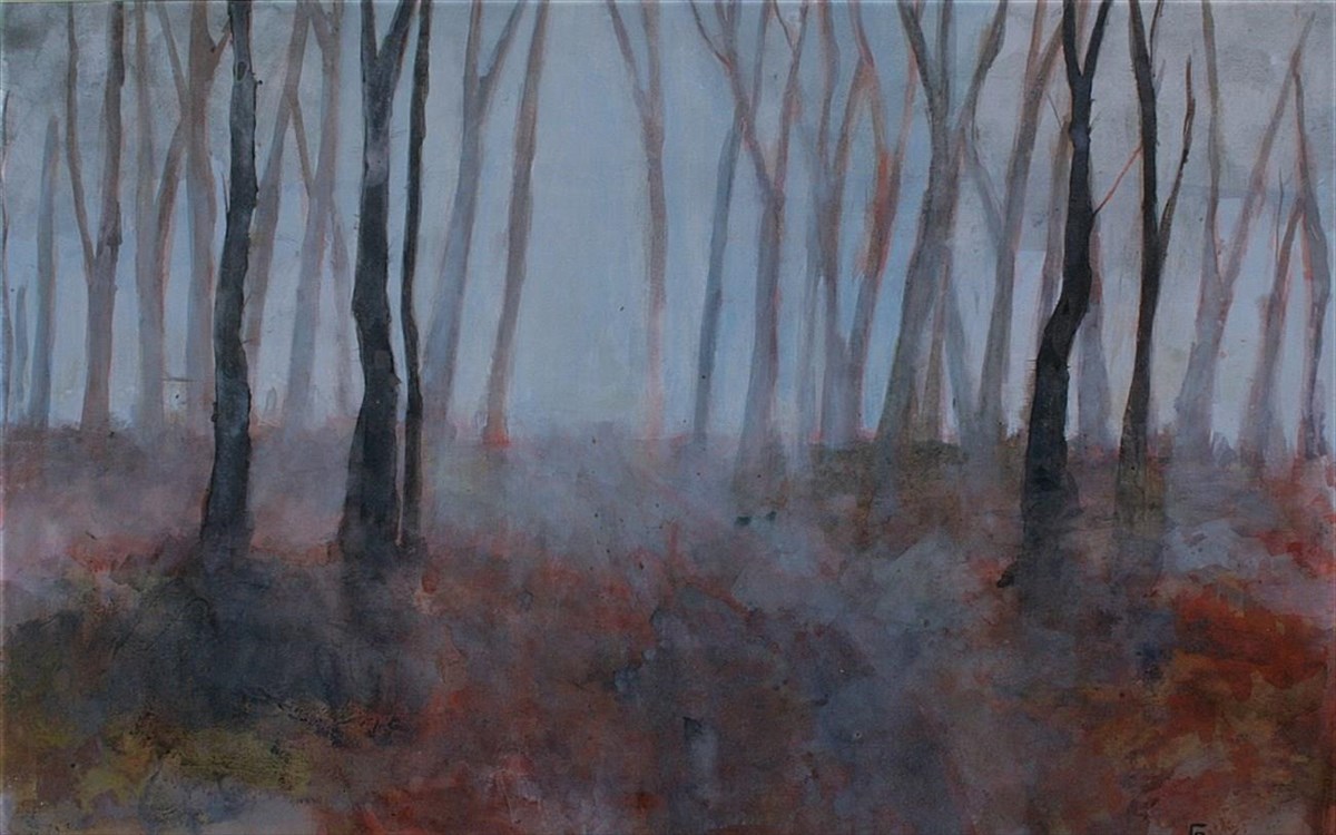 Σαν τα φρικτά χέρια που παλεύουν να ενωθούν στον διάκοσμο τής Καπέλα Σιξτίνα, αυτά τα δέντρα τολμούν παράλληλες διαδρομές, ασύμβατες, όσο κι αν φαινομενικά τείνουν το ένα προς το άλλο. Στην πραγματικότητα είναι ελεύθερα κάτω από τον μουχλιασμένο ουρανό που κρέμεται απειλητικά πάνωθέ τους και προκαλεί αλυσιδωτές αντιδράσεις στο «θυμικό» των αψύχων, που μόνον εμείς, οι βιαστικοί κι αλαζονικοί άπληστοι, ακόρεστοι άνθρωποι θεωρούμε πως στερούνται ζωής κι είναι απλώς αντικείμενο της επιχειρηματικότητάς μας αν όχι και του θαυμασμού μας (σπανιότατα). Αυτά τα τοπία είναι υδαρή, το μελάνι ταιριάζει τέλεια στην αισθητική του, αφού κινούνται ανάμεσα στον ανατολίτικο μινιμαλισμό και στην δυτική πλημμυρίδα συναισθημάτων που είναι δύσκολο να ελεγχθούν, αν όχι να τιθασευτούν εντελώς… Διονυσιακό μαζί με το απολλώνιο, το βακχικό στοιχείο λανθάνει, η πρόθεση όμως του καλλιτέχνη είναι ξεκάθαρη: να ζωγραφίσει σημεία φυγής από έναν κόσμο που δολοφόνησε τη μαγεία του κι εξόρισε την ποιητικότητά του. Ακόμα κι η μουσική είναι ανάμνηση