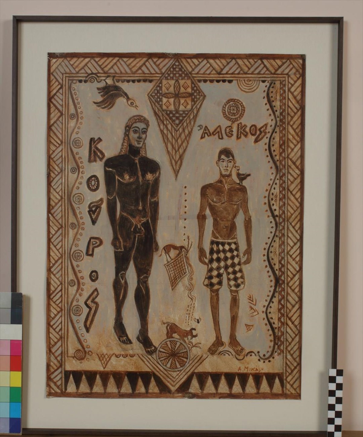 Ακόμη, αφαιρετικά ως προς την απόδοσή τους και χαριτωμένα πουλιά και νεαρά ζώα, ανάλογα με εκείνα που διακοσμούν τις λαβές των τριποδικών λεβήτων αποδίδονται πρωτότυπα σε έργα-επιτοίχια «χαλιά». Εκεί, μαζί με τους σύγχρονους νέους-μοντέλα, εντάσσεται ο περίφημος χάλκινος πολεμιστής της γεωμετρικής περιόδου από την Καρδίτσα, υπερβαίνοντας όχι μόνο τον χρόνο αλλά και τη λειτουργία για την οποία φιλοτεχνήθηκε. Χρωματικά η δημιουργός πειραματίζεται με την παλέτα των αρχαίων χρησιμοποιώντας τα χρώματα των αγγείων: υπόλευκος πηλός, ώχρες κόκκινες και κίτρινες και γανωμένο μαύρο “ντύνουν” τους Κούρους, τους κλασικούς αλλά και τους σύγχρονους. Όλα αυτά με ευαισθησία και καθαρή πρόθεση να μιλήσει η ζωγράφος στο διεθνές φιλότεχνο κοινό που επισκέπτεται το Μουσείο, με ζωγραφικούς όρους σύγχρονους, ζωντανούς. Να προσπαθήσει να μεταδώσει στον θεατή τής συλλογής της το βίωμα, το ότι η τέχνη είναι ενιαία - μια δυναμική έκφραση που υπερβαίνει χρονολογικές και τοπικές ταξινομήσεις.
