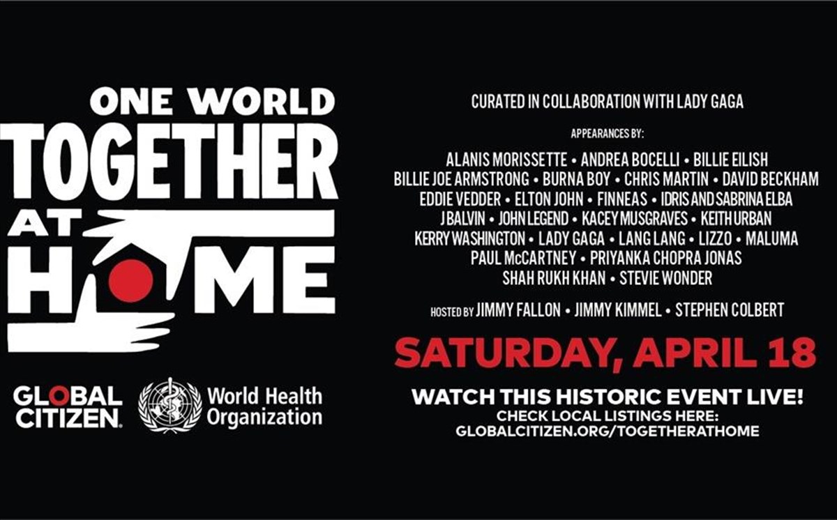 Στις 18 Απριλίου η Lady Gaga σε συνεργασία με την φιλανθρωπική οργάνωση Global Citizen έχει προγραμματίσει μια συναυλία που έχει στόχο να ενισχύσει τον Παγκόσμιο Οργανισμό Υγείας. Μέχρι στιγμής έχουν συγκεντρωθεί περίπου 35 εκατομμύρια δολάρια, τα οποία θα διατεθούν στο ειδικό ταμείο αντιμετώπισης του νέου κορωνοϊού COVID19 για την αγορά προστατευτικού και υγειονομικού εξοπλισμού.