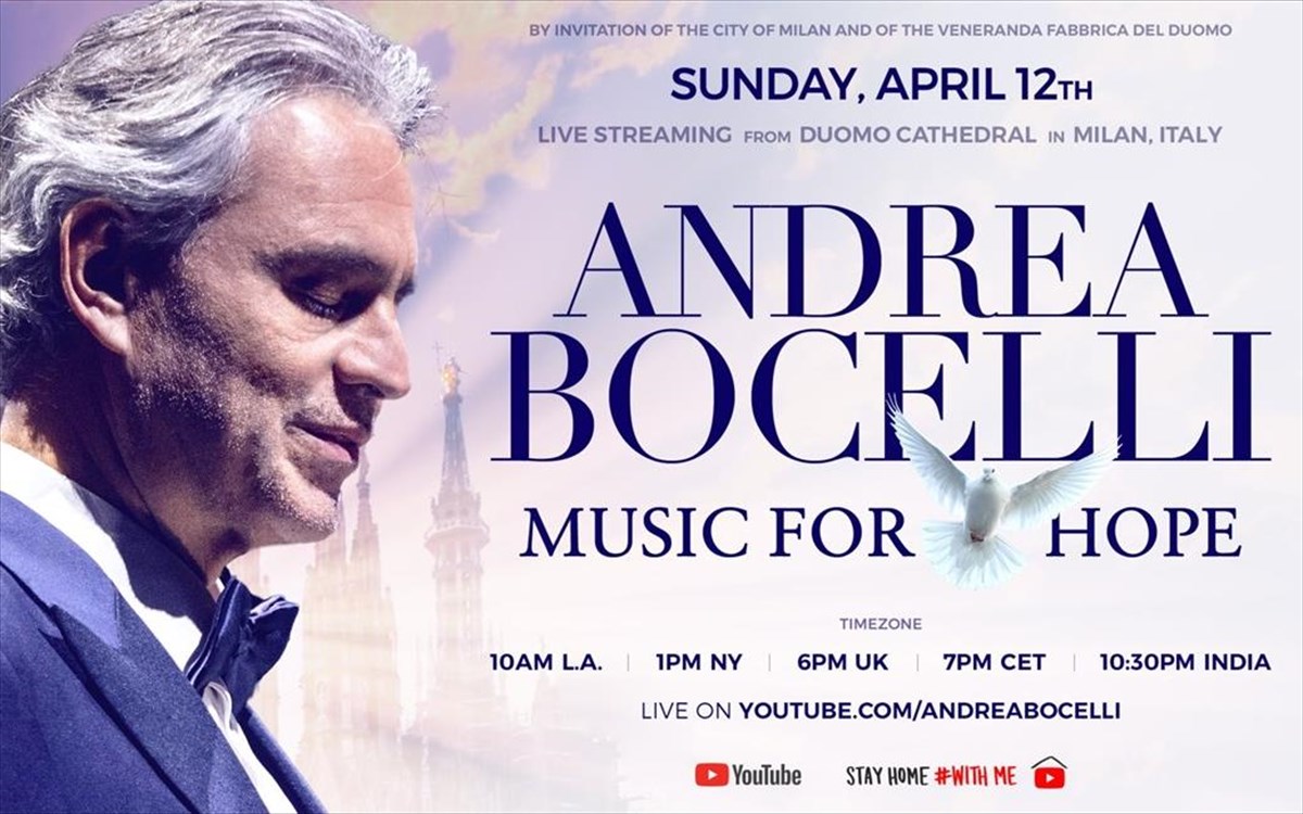 Η συναυλία του Andrea Bocelli στον καθεδρικό ναό του Μιλάνου θα πραγματοποιηθεί την Κυριακή στις 20:00 ώρα Ελλάδος και θα μεταδοθεί ζωντανά από το κανάλι του στο YouTube. Μέσω του ιδρύματος του, το Andrea Bocelli Foundation, ο Ιταλός τενόρος έχει ξεκινήσει έναν διαδικτυακό έρανο για να στηρίξει τα νοσοκομεία και το υγειονομικό προσωπικό της χώρας