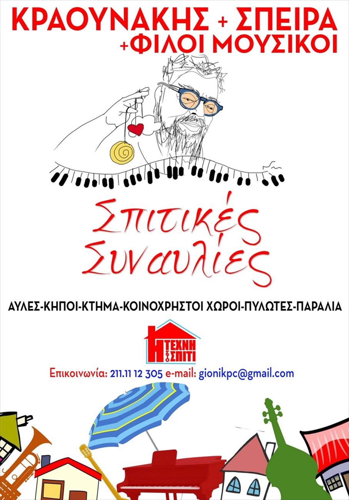 Ο Σταμάτης Κραουνάκης, η Σπείρα και φίλοι μουσικοί ερχόμαστε σπίτι και παίζουμε για σας. Αυλή, πυλωτή, κήπος, κτήμα, παραλία, κοινόχρηστοι χώροι, εξοχικό. Φέρνουμε εμάς, τα όργανα τον ήχο, ανάλογα την περίσταση. Βάζετε το χώρο, κανονίζετε καλεσμένους φίλους, καλούς γείτονες (και κακούς θα τους ισιώσουμε).