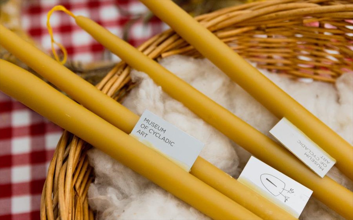 Μια λαμπάδα από φυσικό κερί αξίας 30 € με το λογότυπο του Μουσείου και μια παραλλαγή της κυκλαδικής κεφαλής από Λινού Σουμπάσης και σια αποκλειστικά για το Μουσείο Κυκλαδικής Τέχνης.