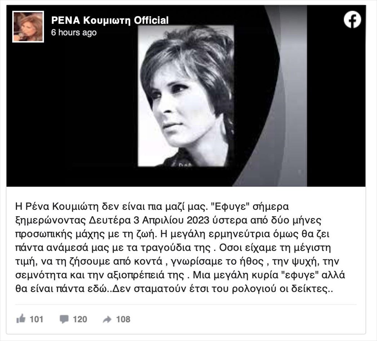 «H Ρένα Κουμιώτη δεν είναι πια μαζί μας. "Έφυγε" σήμερα ξημερώνοντας Δευτέρα 3 Απριλίου 2023 ύστερα από δύο μήνες προσωπικής μάχης με τη ζωή.