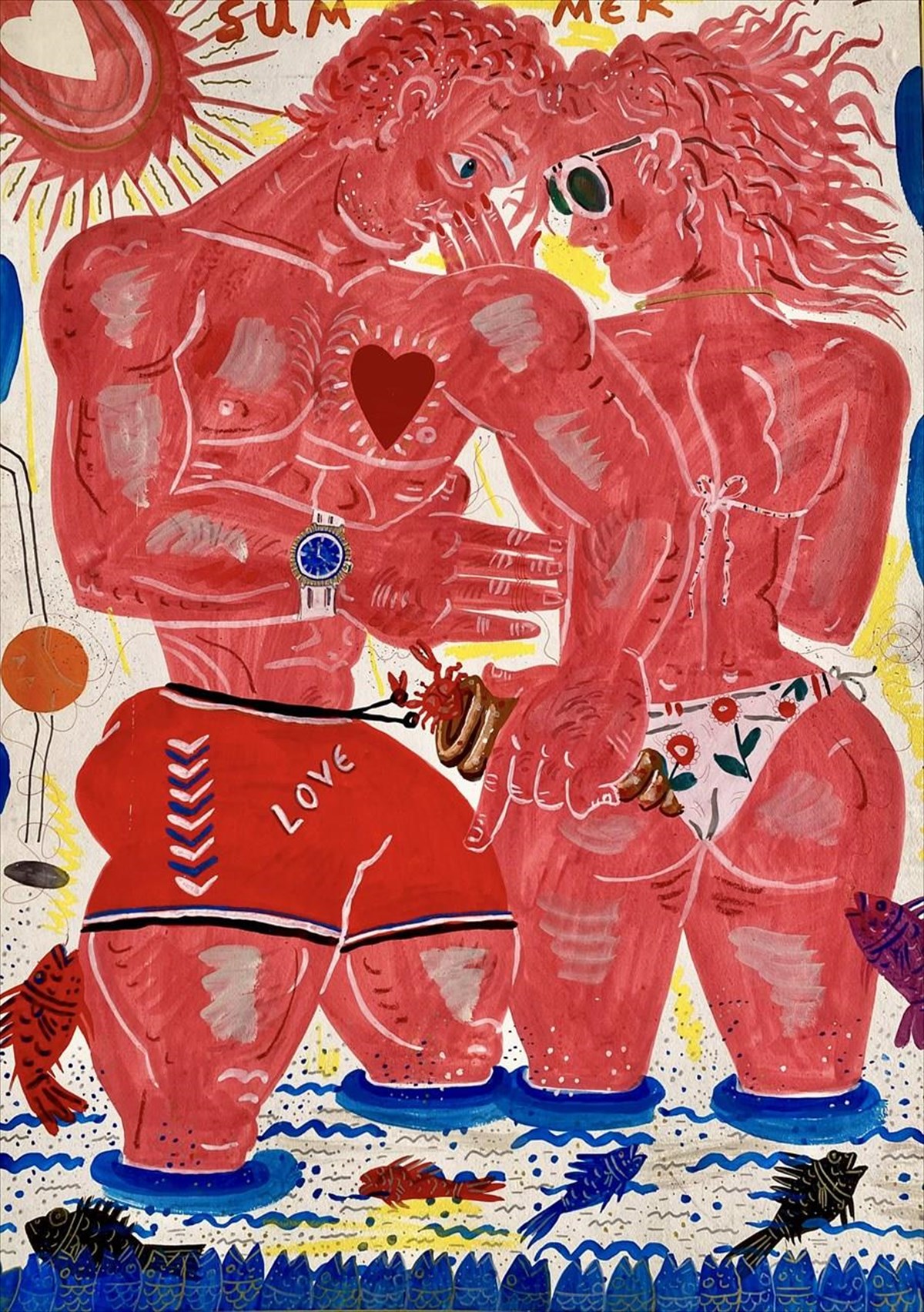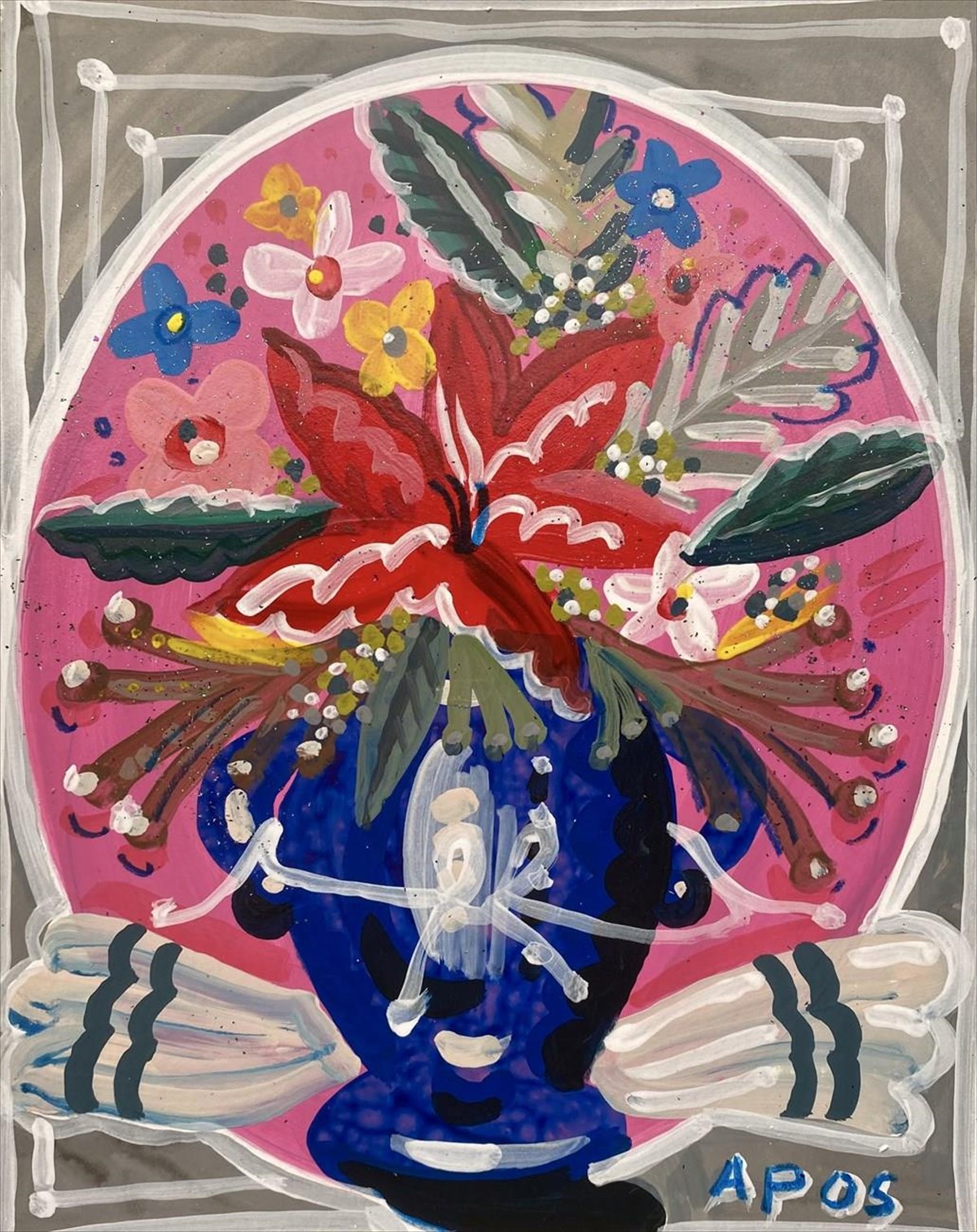 Αυτό, συμβαίνει και με τα τόσα άλλα θέματα. Αρχετυπικά μοτίβα-σύμβολα, όπως άλογα, πεταλούδες, πετεινοί, δράκοι-φίδια, σειρήνες-γοργόνες, ψάρια κά., περιφρονούν όρια και περιορισμούς, ενώ τα εντυπωσιακά και με έντονα χρώματα υπερμεγέθη λουλούδια στα βάζα, δεμένα σε μπουκέτα με ένα χαρακτηριστικό λευκό, λεπτεπίλεπτο κορδελάκι, μαγεύουν και δοκιμάζουν την οπτική μας αντοχή, σε φόντο δουλεμένο από στρώσεις με σφουγγίσματα, γλυκασμό και λαζούρες.