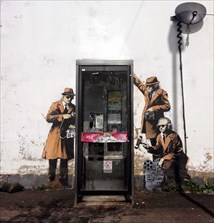 Η τοιχογραφία του Banksy με θέμα την παρακολούθηση πολιτών από κυβερνητικές υπηρεσίες απεικόνιζε έναν τηλεφωνικό θάλαμο να περιτριγυρίζεται από τρεις πράκτορες.