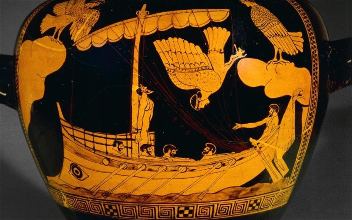 Στην Οδύσσεια του Ομήρου, ο Οδυσσέας ακούει το μελωδικό και ελκυστικό τραγούδι των Σειρήνων, που παρασύρει τους ναυτικούς προς τον θάνατο. Όλο το πλήρωμα του πλοίου του έκλεισαν τα αυτιά τους καλά, ενώ ο ίδιος ο Οδυσσέας δέθηκε επάνω στο κατάρτι για να μην μπορεί να φύγει. Σε αυτό το ερυθρόμορφο βάζο αποτυπώνεται η ένταση του Οδυσσέα και των ναυτών του, που προσπαθούσαν να μην υποκύψουν στο μαγευτικό αυτό τραγούδι.