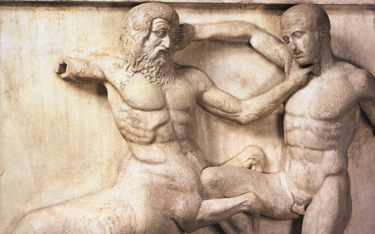 Η βία και ο πόλεμος είναι ένα από τα πιο αγαπημένα θέματα των αρχαίων ελλήνων καλλιτεχνών. Στην μετόπη του Παρθενώνα εμφανίζεται μια σκηνή με τη μάχη ενός ανθρώπου με έναν Κένταυρο. Η σκηνή είναι απίστευτα ρεαλιστική.