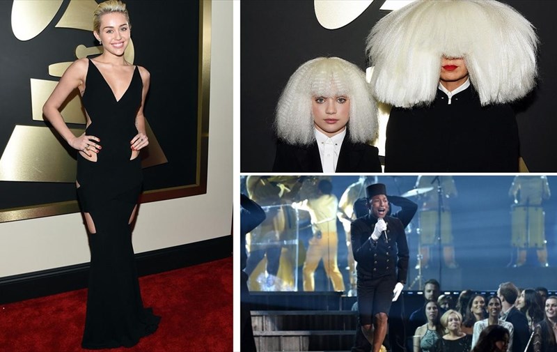 Ο Pharrell Williams αν και έφτασε με ένα λευκό κοστούμι με βερμούδα, όταν ανέβηκε στη σκηνή μεταμορφώθηκε σε γκρουμ ξενοδοχείου. Η Miley Cyrus από την άλλη, μάλλον συντηρητική θα την έλεγε κανείς, μέσα στην κατάμαυρη τουαλέτα με τα σκισίματα.