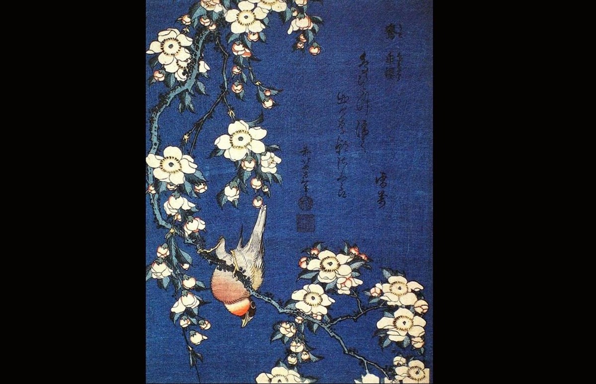 Σε αυτόν τον πίνακα δύσκολα διακρίνεις ποια πλευρά είναι η πάνω και ποια η κάτω με αποτέλεσμα το έργο να συναντάται συχνά τοποθετημένο ανάποδα. Σε αυτό το μπέρδεμα συμβάλλει η ζωγραφική τεχνική του Hokusai, ο οποίος επέλεξε να σχεδιάσει τα λευκά και ροζ μπουμπούκια με τέτοιο τρόπο ώστε να χάνεται η αίσθηση της βαρύτητας και τα λουλούδια σχεδόν να αιωρούνται. Ταυτόχρονα, η στάση του πουλιού κάθε άλλο παρά βοηθάει το θεατή να προσανατολιστεί μέσα στον πίνακα. Το υπέροχο δημιούργημα του Ιάπωνα καλλιτέχνη με τα άνθη κερασιάς πάνω στον μπλε ουρανό ταξιδεύει το νου σε ανοιξιάτικα δειλινά στην εξοχή.