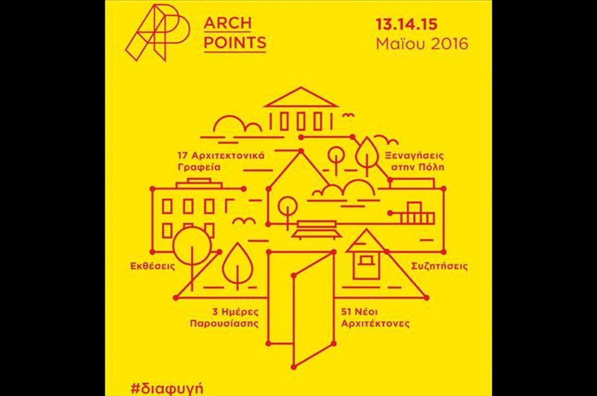 Το Arch Points αποτελεί μια πρωτοβουλία για την προβολή της δραστηριότητας των νέων Ελλήνων αρχιτεκτόνων, με κοινό θεματικό άξονα τη #διαφυγή. Τι είναι η διαφυγή; Πώς την εντοπίζουμε στο χώρο και την αρχιτεκτονική; Από τις 13 έως τις 15 Μαΐου, 17 αρχιτεκτονικά γραφεία ανοίγουν τις πόρτες τους για πρώτη φορά στο κοινό και 5 αρχιτεκτονικές ξεναγήσεις μας προσκαλούν σε μία εναλλακτική περιήγηση στο κέντρο της Αθήνας!