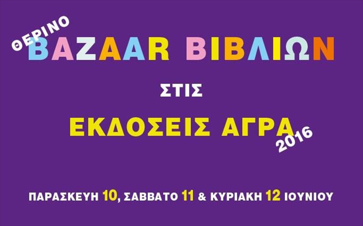 Οι εκδόσεις Άγρα οργανώνουν μεγάλο παζάρι βιβλίων που θα ξεκινήσει στις 10 Ιουνίου και θα διαρκέσει για δυο ημέρες, στην διάρκεια των οποίων μπορείτε να διαλέξετε ανάμεσα σε μεγάλο αριθμό τίτλων, σε χαμηλές τιμές. Το bazaar ξεκινά στις 3 το μεσημέρι της 10ης Ιουνίου και λήγει στις 8.30 της 12ης του μηνός.
