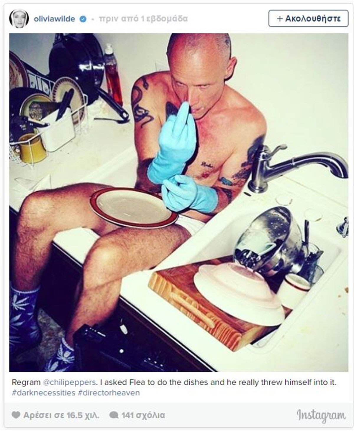 Η ηθοποιός ενημέρωσε μάλιστα τον προσωπικό της λογαριασμό στο Instagram μέσα από μια χαρακτηριστική φωτογραφία που απεικονίζει τον Flea να τζαμάρει μέσα σε ένα νεροχύτη.