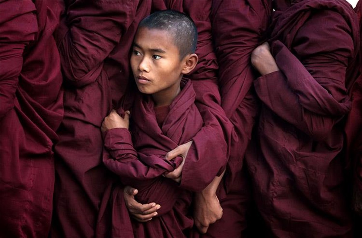 Alain SchroederMyanmar, Bagan, © Alain Schroeder At 7AM during the annual festival of Ananda Pagoda in Bagan, monks line up to receive alms prepared by devotees who have journeyed from all corners of the country. A young monk finds himself stuck in between his brothers in the shuffle.