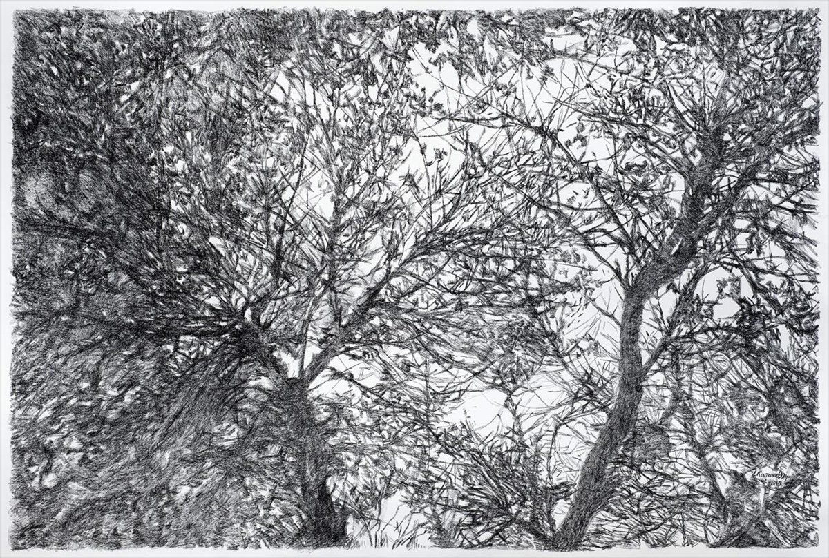 Μαζί με την ενότητα αυτή, η Κουτσουκέλλη θα παρουσιάσει επίσης μερικά μεγάλα έργα από κάρβουνο σε χαρτί. Με ζωγραφικό πρόσχημα τη λεπτομερή απεικόνιση πυκνών φυλλωμάτων δέντρων σε αφοπλιστική απόσταση αναπνοής, η Κουτσουκέλλη δημιουργεί ζωγραφικά παράθυρα που ανοίγουν τόσο προς τη φύση και τη δεξιοτεχνία της αναπαράστασής της, όσο και προς την αφήγηση μιας εσωτερικής πραγματικότητας την οποία αποκαλύπτουν οι ατέρμονες διαδρομές του κάρβουνου πάνω στο χαρτί.”