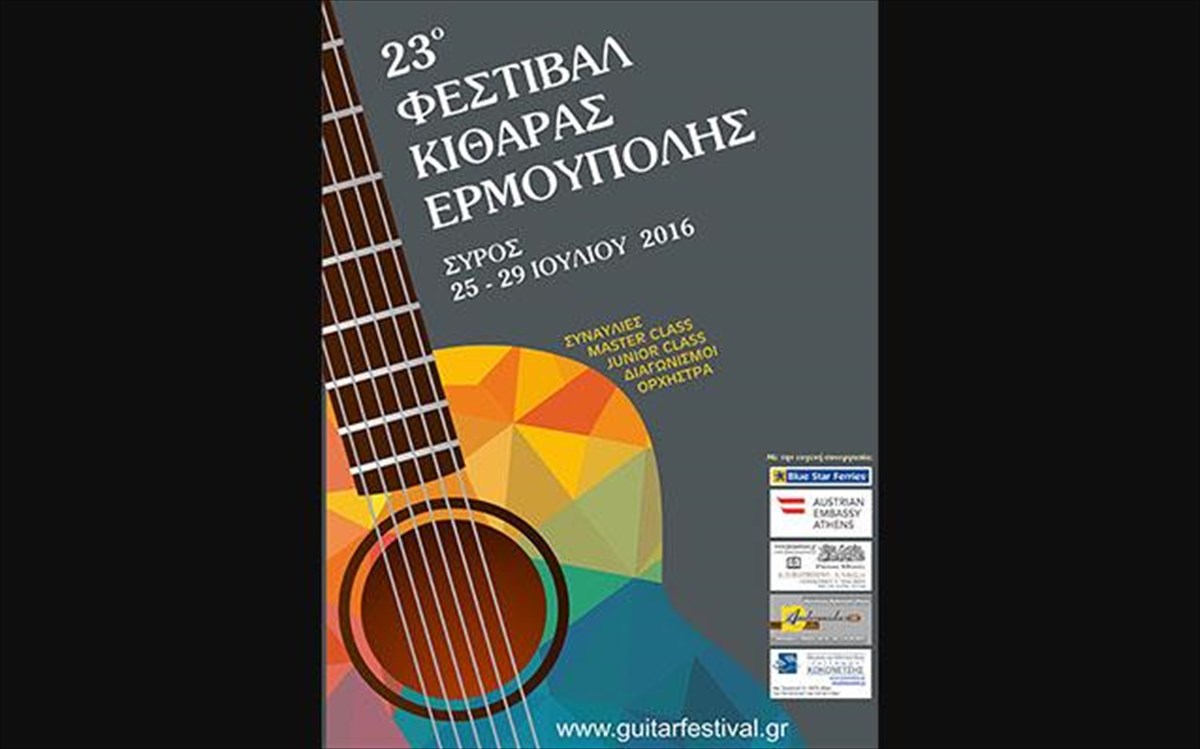 Το 23ο Φεστιβάλ κιθάρας Ερμούπολης μας προσκαλεί σε ένα ακόμη απολαυστικό μουσικό ταξίδι. Μια πολυσυλλεκτική παλέτα με ακούσματα από διαφορετικά είδη μουσικής (κλασσική, έντεχνη, ρεμπέτικο, γαλλικό τραγούδι, μπλουζ, κ.α.) συνθέτουν το πρόγραμμα του φεστιβάλ για το 2016.