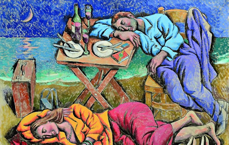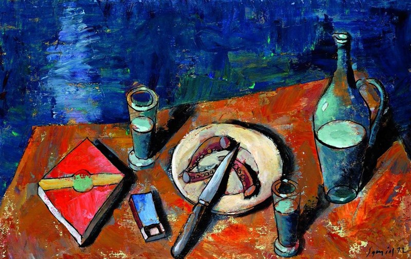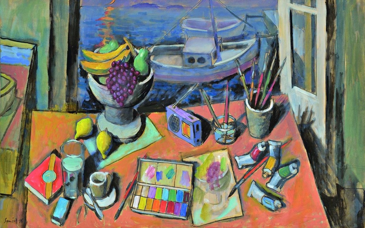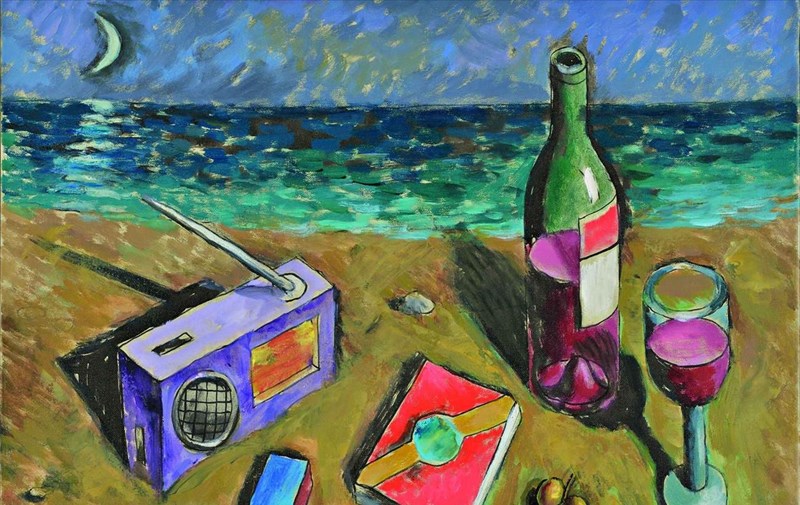 Τα αιώνια σύμβολα του καλοκαιριού είναι εδώ: μια δροσερή φέτα καρπούζι, ένα ζουμερό σταφύλι, ένα ποτήρι κρασί, το τρανζίστορ στην αμμουδιά, τα μικρά εκκλησάκια. Δεν λείπουν και τα πινέλα του ζωγράφου αλλά και αυτό το ίδιο το ατελιέ με το ανοικτό παράθυρο στη θάλασσα, που γίνεται φορέας έμπνευσης και δημιουργίας.