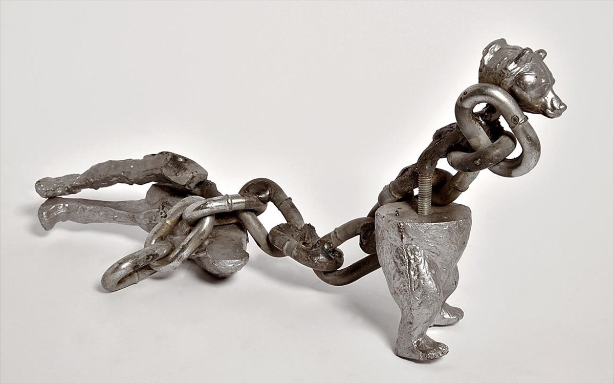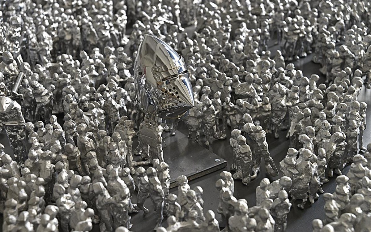 Παράλληλα, στις οριζόντιες, επιμήκεις πλευρές του χώρου, αναπτύσσονται σε φρίζα με συνεχή διάταξη, μικρά γλυπτά από αλουμίνιο που κατασκεύαζε συστηματικά τις τελευταίες δεκαετίες της δημιουργικής του πορείας. Αυτοτελή έργα αλλά και συνάμα σημειώσεις ενός ατελεύτητου «έργου εν προόδω», γλυπτικοί πειραματισμοί ή ερευνητικές χειρονομίες, τα γλυπτά αυτά ήταν προσεκτικά ταξινομημένα, κωδικοποιημένα και αριθμημένα σε κουτιά που κάλυπταν απ’ άκρη σ’ άκρη τα ράφια του εργαστηρίου. Διακόσια πενήντα, περίπου, από αυτά επιλέχθηκαν και τοποθετήθηκαν σε ρευστή διάταξη, χωρίς ιεράρχηση ή ομαδοποίηση, με τρόπο που να συνθέτουν ένα «κείμενο», το νόημα του οποίου γίνεται αντιληπτό μέσω των αλληλουχιών και των διαφοροποιήσεων. Πρόκειται για ένα αρχείο γλυπτών τα οποία αντιπαρατίθενται και διασταυρώνονται, αρθρώνοντας μια αφήγηση γύρω από την ανθρώπινη κατάσταση, τα αινίγματα της ύπαρξης, την ιστορία, την ατομικότητα και το πλήθος, με έντονο το παράδοξο και το ειρωνικό στοιχείο.