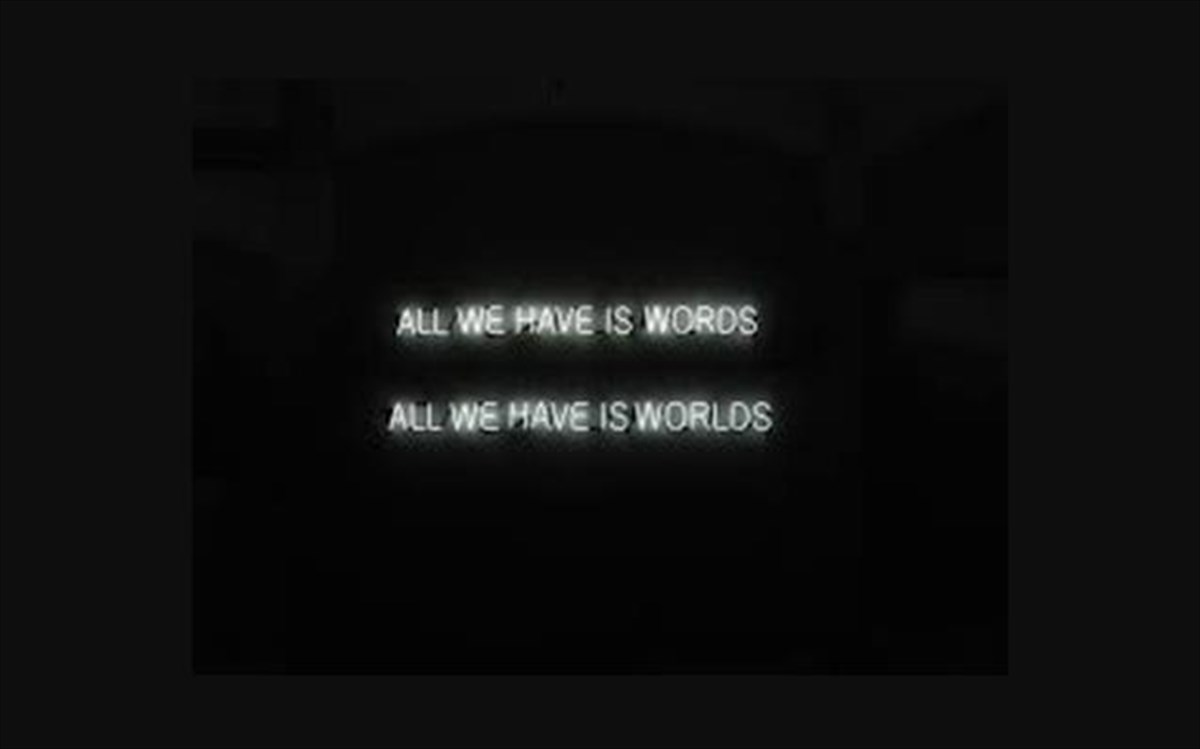 «Είμαστε τα λόγια μας, είμαστε οι κόσμοι μας» υποδεικνύει ο Βρετανός καλλιτέχνης Τιm Etchells, ο οποίος μέσα από το έργο του αποπειράται να ανακαλύψει τί είναι τελικά αυτό που συνιστά και περικλείει τις ζωές μας. Το συμπαγές υλικό ενός κόσμου ή το εφήμερο υλικό της γλώσσας και των ιδεών; Άραγε, τα λόγια είναι εργαλεία για να αποκωδικοποιήσουμε τον εύθραυστο και προσωρινό κόσμο που μας περιβάλλει; Η απάντηση «κρύβεται» στον ίδιο τον τίτλο. Μια εγκατάσταση με γράμματα νέον στο εξωτερικό του κτιρίου της Στέγης και πολλές φράσεις μέσα στο κτίριο που μας καλούν να τις ανακαλύψουμε.