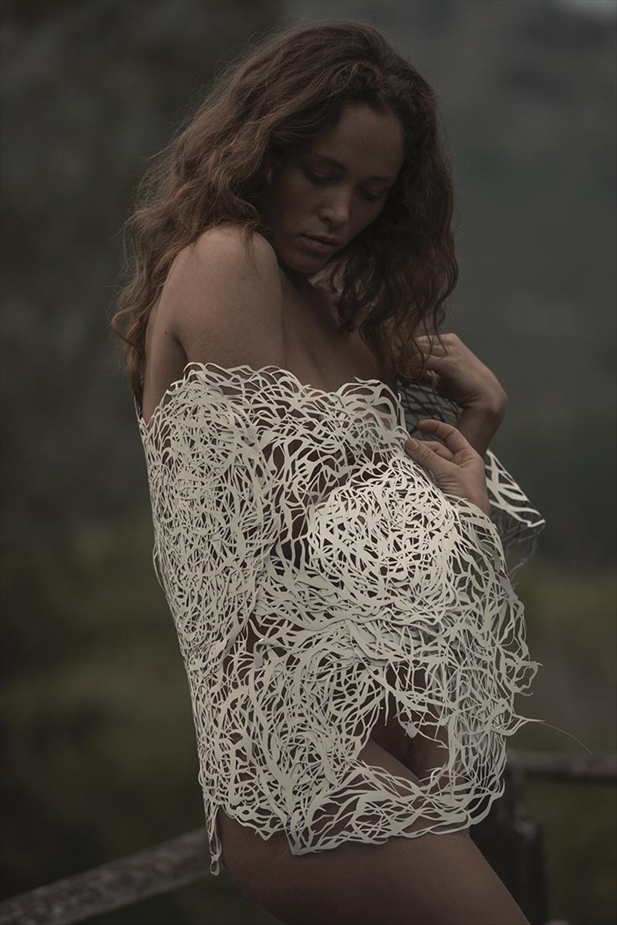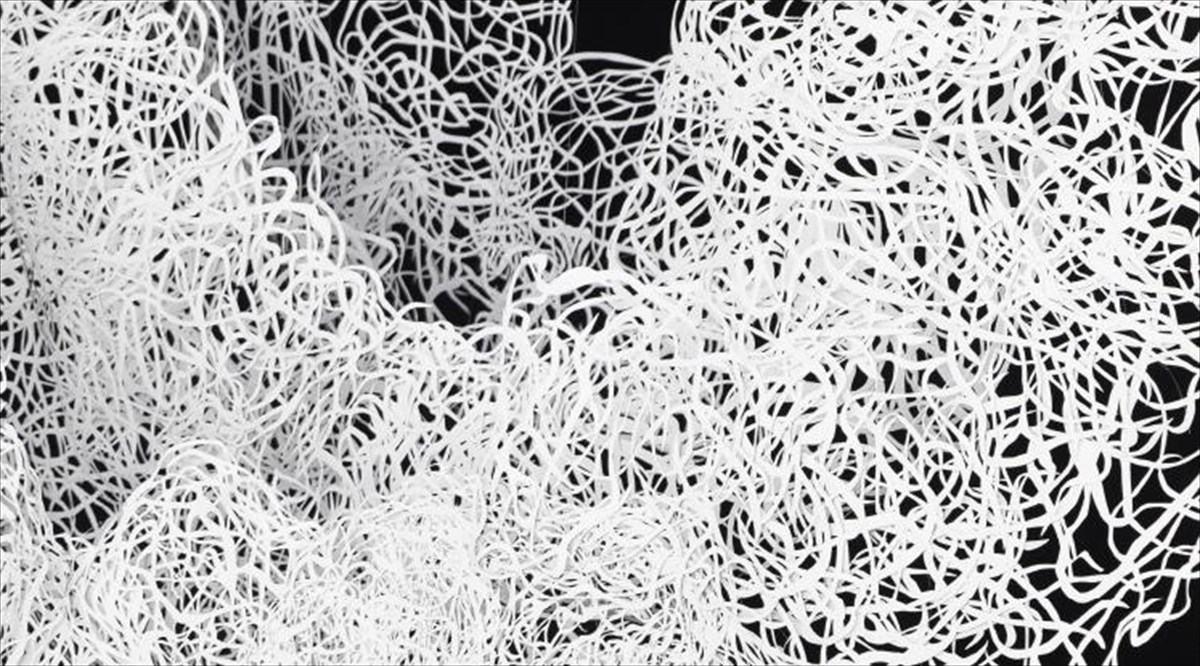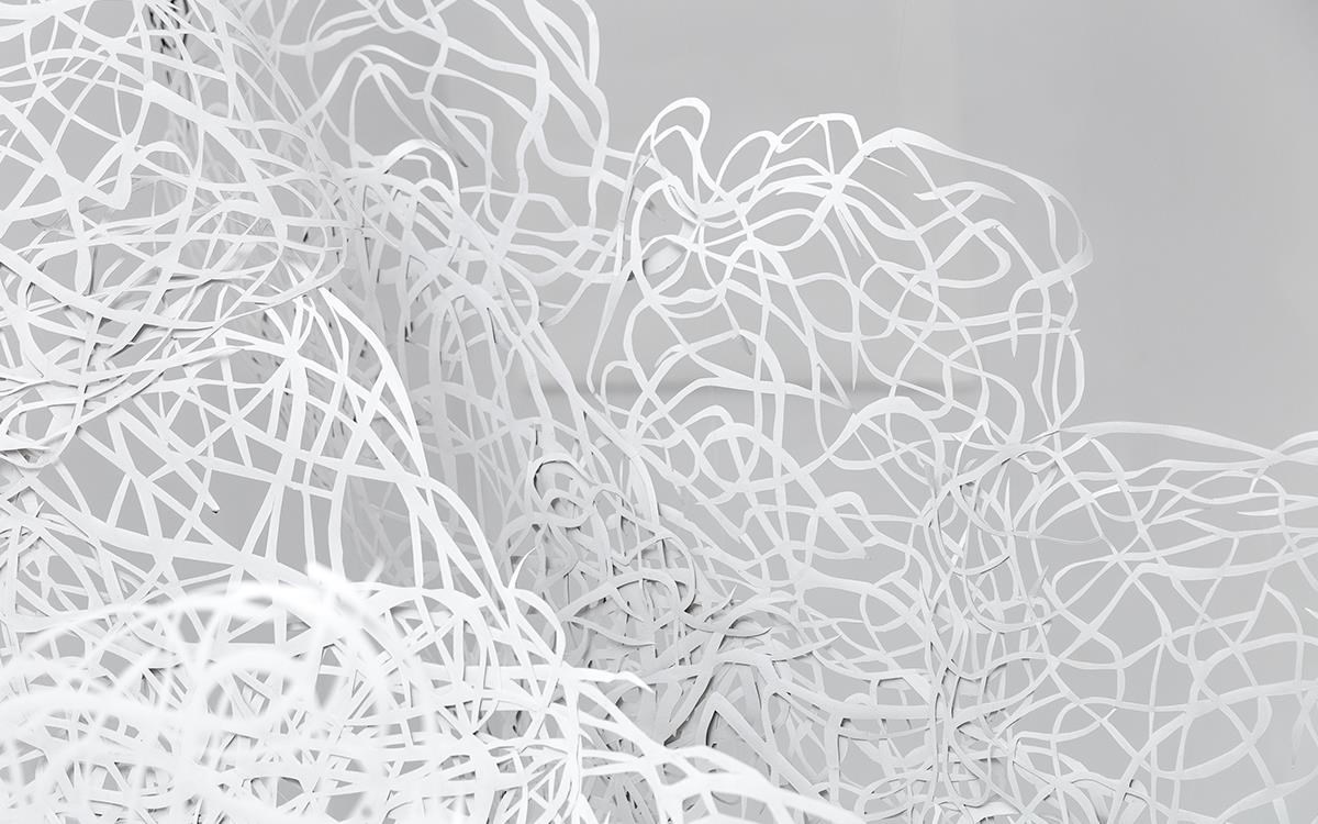 Τα ρυθμικά επαναλαμβανόμενα μοτίβα συνθέτουν έναν τρισδιάστατο αέρινο κόσμο εμπνευσμένο από τις καμπύλες της φύσης. Το τεχνητό αυτό περιβάλλον αναπτύσσεται μέσα σε αχνά όρια που εκφράζουν μια ανάγκη φυγής και άρνησης αυστηρού περιορισμού, μια συμβολική χωρική ελευθερία.