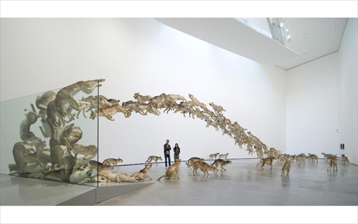 FMGBGuggenheim Bilbao Museoa / Erika Barahona-EdeΗ εγκατάσταση «Head On» του Κινέζου καλλιτέχνη με βάση την Νέα Υόρκη Cai Guo-Qiang αποτελείται από 99 αληθοφανείς λύκους οι οποίοι πηδάνε από την μια άκρη του δωματίου στην άλλη, προσκρούοντας πάνω σε έναν γυάλινο τοίχο. Οι λύκοι σχηματίζουν ένα σαρωτικό τόξο που καταλήγει απότομα σε μια στοίβα από άψυχα σώματα. Το έργο λειτουργεί ως οπτική μεταφορά των κινδύνων της νοοτροπίας της αγέλης και της ανέμελης παρορμητικότητας χωρίς συμβιβασμούς. Ο ίδιος ο καλλιτέχνης είχε κατά νου το τείχος του Βερολίνου που κτίστηκε το 1961 και κατέρρευσε το 1989.