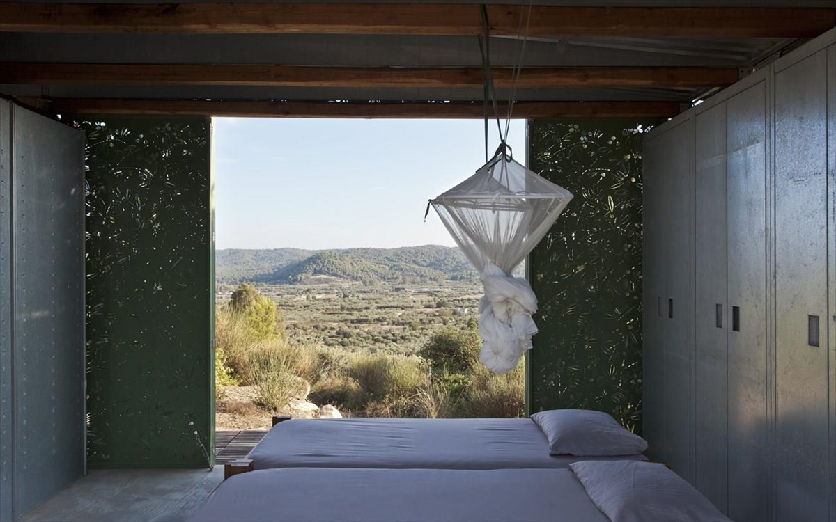 Μαριάνα ΜπίστηΗ επιθυμία των πελατών για αυτή τη μικρή θερινή κατοικία στη Σιθωνία Χαλκιδικής αφορούσε ένα σπίτι διακοπών με χαμηλές απαιτήσεις συντήρησης, σε οικόπεδο με ελαιώνα και θέα προς τη θάλασσα και το Άγιο Όρος. Το εξωτερικό περίβλημα αποτελείται από ελαφρά μεταλλική επιφάνεια που τυλίγεται στην όψη και είναι κινητή, ώστε να προσφέρει μεταβλητότητα. Ο σχεδιασμός του περιβλήματος με το διάτρητο σχέδιο, που θυμίζει ύφασμα, εμπνέεται από τη φυλλωσιά και τη σκιά των ελαιοδέντρων. Με την κίνηση του ηλίου κατά τη διάρκεια της ημέρας οι εσωτερικοί χώροι γεμίζουν με εναλλασσόμενες σκιάσεις.