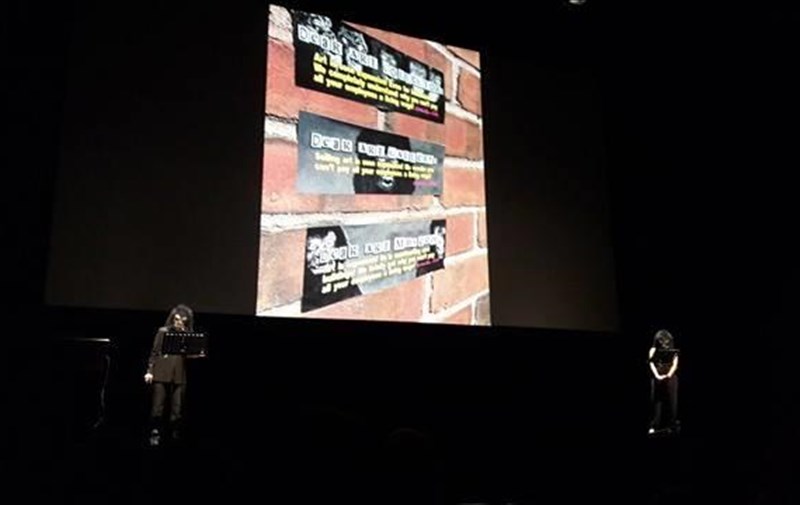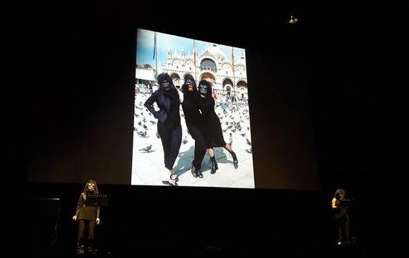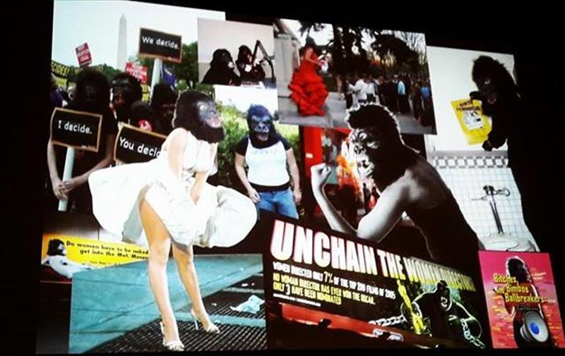 Ντυμένες στα μαύρα, οι «Frida Kahlo» και η «Käthe Kollwitz» -δανείζονται πάντα τα ονόματα μεγάλων καλλιτέχνιδων που δεν είναι πια εν ζωή- και με αναφαίρετο αξεσουάρ τις μάσκες γορίλα, ανέβηκαν στα πόντιουμ και ξεκίνησαν την αφήγησή τους με διάφορες ατάκες για τις γυναίκες. Ατάκες είτε επιβράβευσης, είτε επικριτικές, όπως εκείνες που τους έστειλε ένας Ιταλός κριτικός τέχνης στην αρχή της πορείας τους.