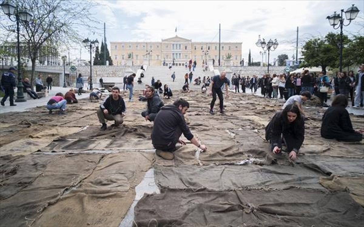 Ibrahim Mahama «Check Point Prosfygika. 1934–2034. 2016–2017» (Σημείο ελέγχου Προσφυγικά. 1934-2034. 2016-2017), 2017, περφόρμανς με σακιά από κάρβουνο στην Πλατεία Συντάγματος