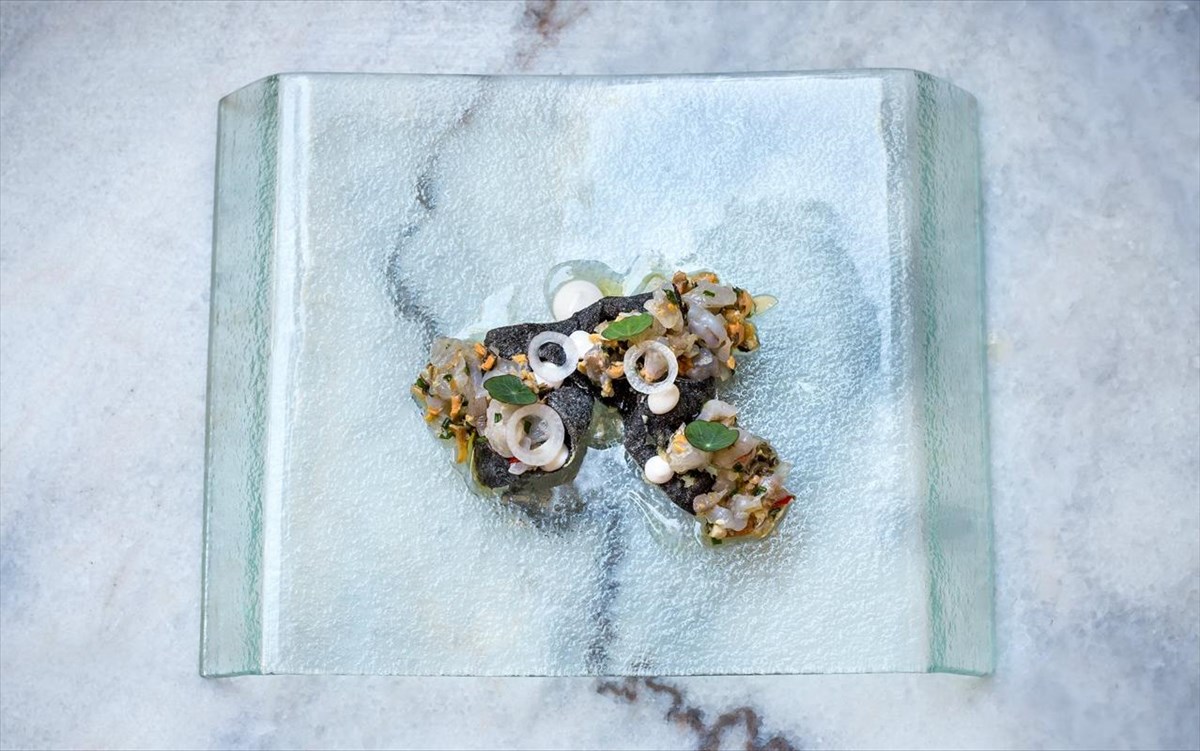 Το tartare γαρίδας με μύδια τουρσί και ταραμά πάνω σε λαζάνι με μελάνι σουπιάς