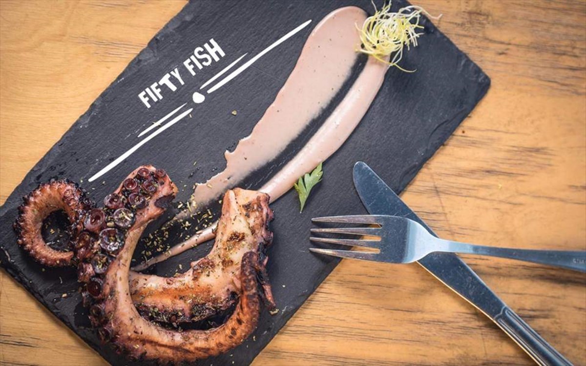 Σε όμορφο, περιποιημένο και προσεγμένο περιβάλλον, με τους τόνους του γαλάζιου και του ανοιχτόχρωμου ξύλου να συνδυάζονται και οι θαλασσινές νότες να μη λείπουν, το Fifty Fish σερβίρει εκλεκτές και μοντέρνες θαλασσινές γεύσεις, όπως φρέσκο χταποδάκι με μαγιονέζα ελιάς, φρέσκα ζυμαρικά με μελάνι σουπιάς και θαλασσσινά, κολοχτύπα με χωριάτικες χυλοπίτες, γιουβέτσι γαρίδας και πολλά άλλα.