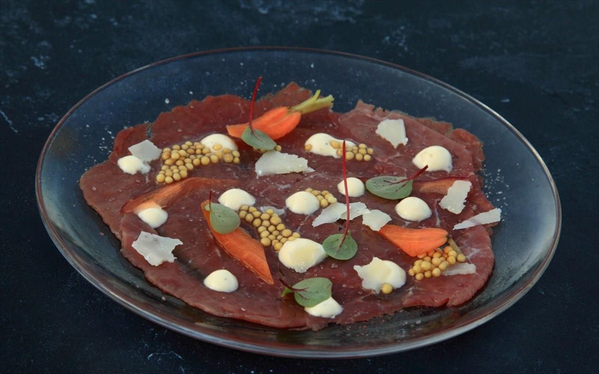 Εμείς ξεκινήσαμε με ένα δροσερό ροζέ La Tour Melas IDYLLE που ταιριάζει στο καλοκαίρι και καρπάτσιο από βιολογικό μοσχαρίσιο κρέας (7 ευρώ), με μαγιονέζα, καρότο, flakes παρμεζάνας και κόκκους μουστάρδας, το οποίο αποτέλεσε ευχάριστο ξεκίνημα. Το καρπάτσιο δροσερό, με ήπια γεύση να δένει αρμονικά με τα υπόλοιπα στοιχεία του πιάτου και τους κόκκους μουστάρδας να χαρίζουν πρωτοτυπία.