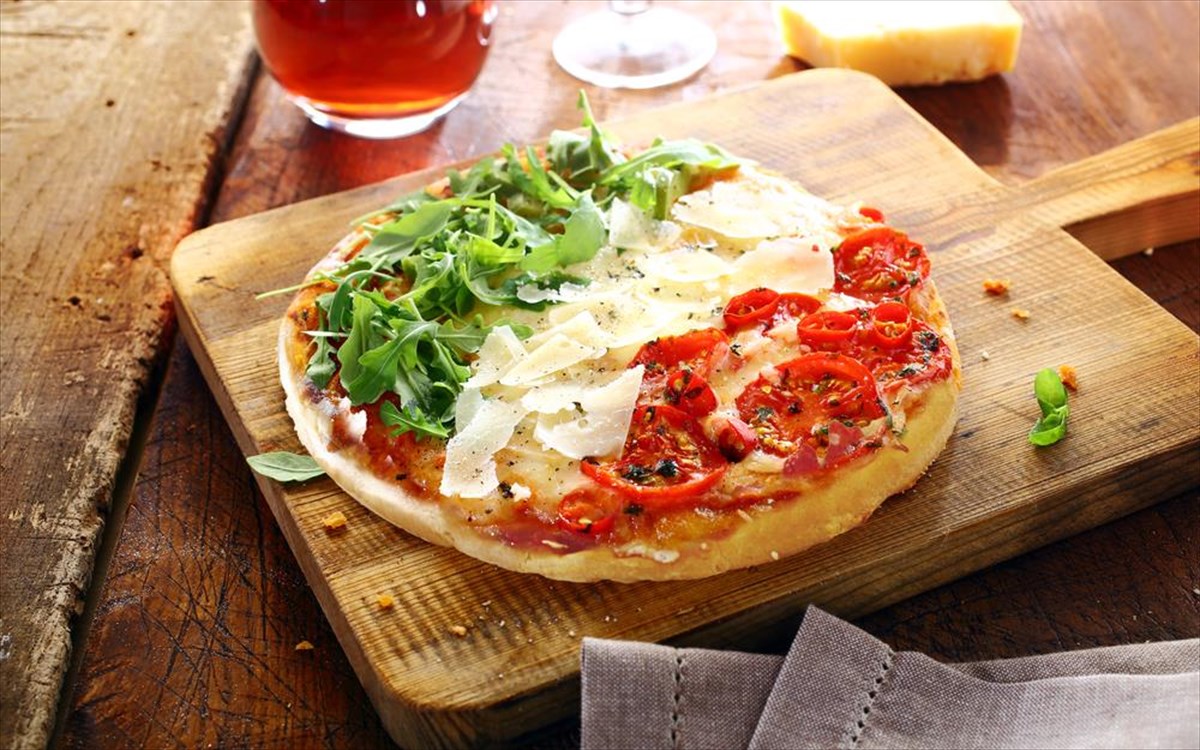 1. Margherita: σάλτσα τομάτας, φρέσκια μοτσαρέλα, τριμμένη παρμεζάνα και πεκορίνο