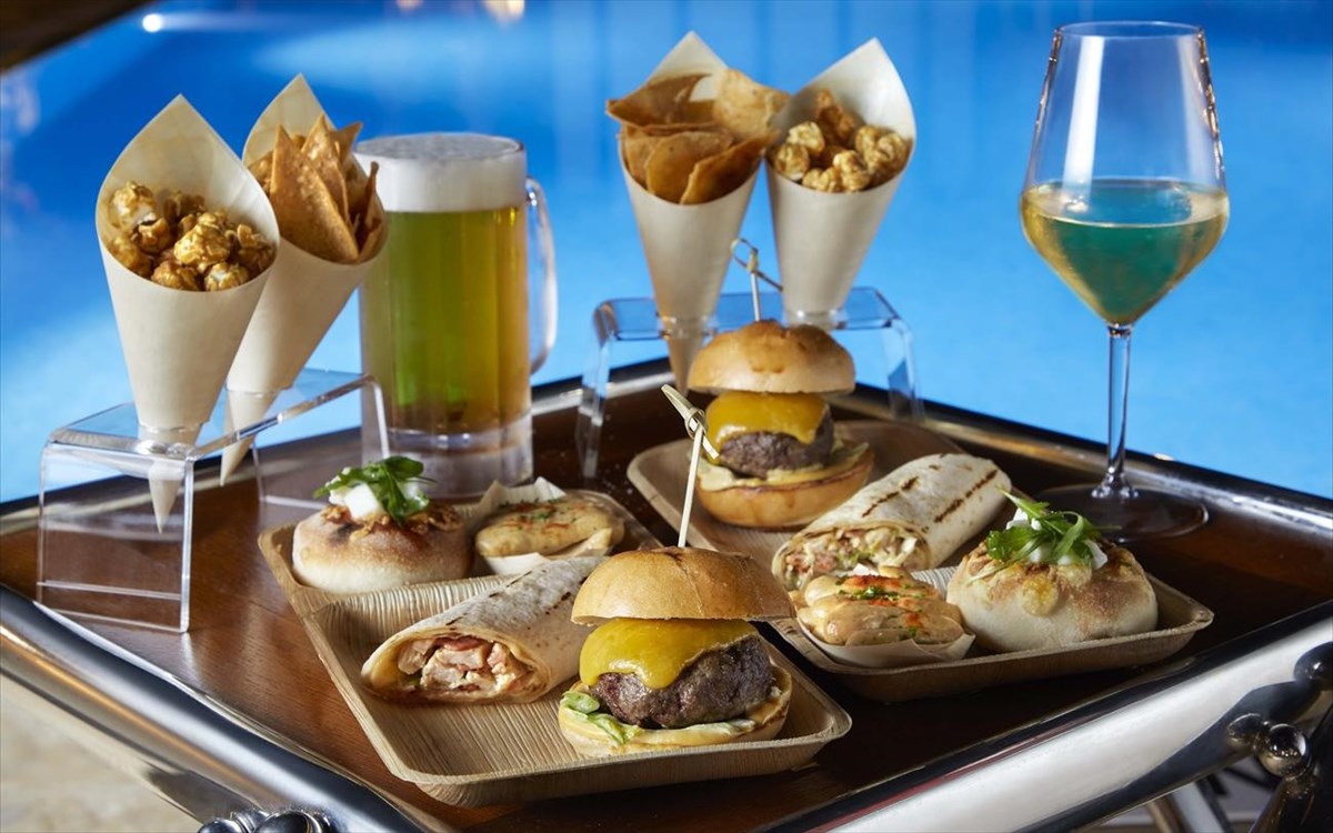 Το σκηνικό είναι αναπόφευκτα ρομαντικό, δίπλα στην πισίνα με φόντο το λόφο του Λυκαβηττού και τα φώτα της πόλης καθώς σουρουπώνει, και ολοκληρώνεται με ένα απολαυστικό ατομικό σετ μενού με fingerfood, που θα συνοδεύσει το ποτό σας καθώς εσείς χαλαρώνετε στις αναπαυτικές πολυθρόνες της πισίνας, με την υπογραφή του Executive Chef Αστέριου Κουστούδη.
