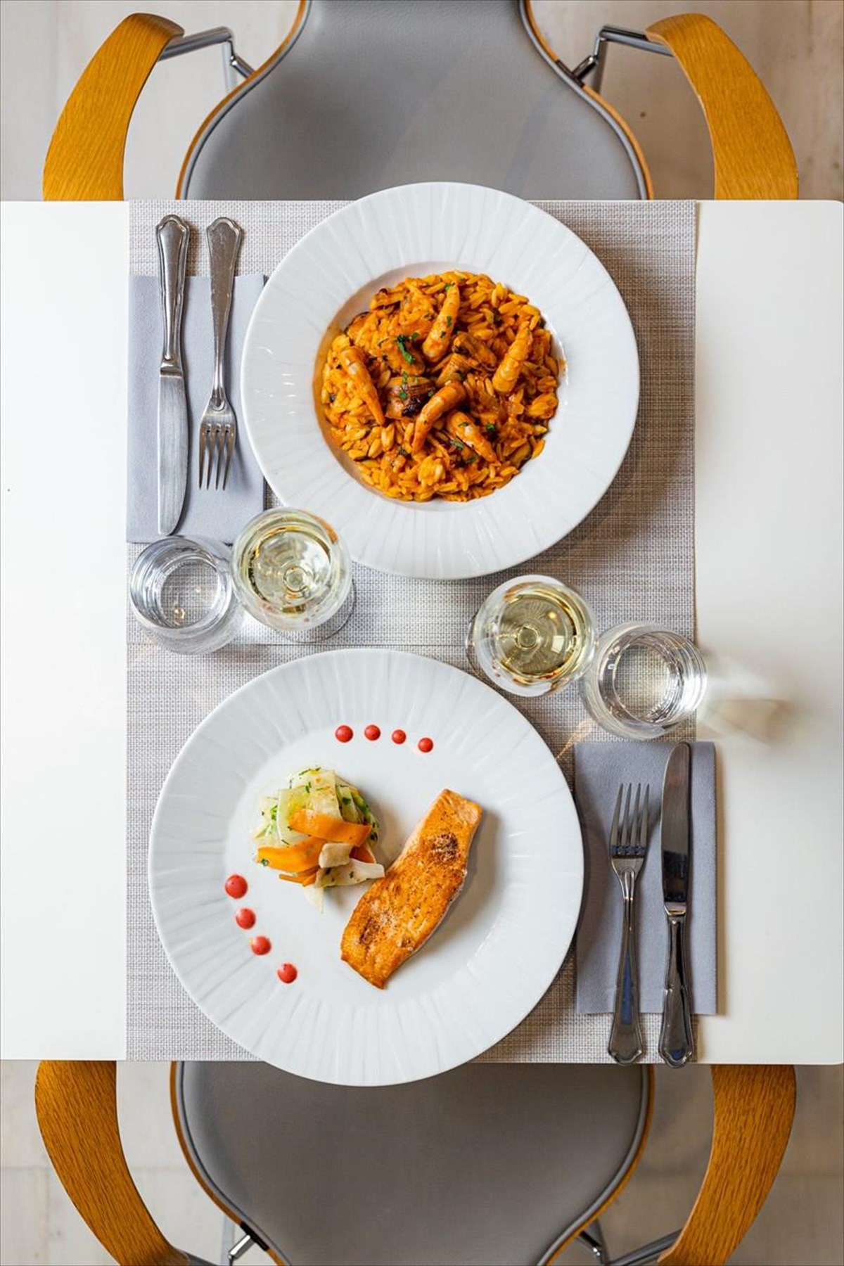 Για περισσότερο άρωμα Ελλάδας σας προτείνουμε το κοκκινιστό μοσχάρι με χυλοπίτες, με πλούσια, κυριακάτικη και νοσταλγική γεύση, ενώ αν είστε του ψαριού δοκιμάστε τον σολομό με ταλιατέλες από καρότο, σέλερι, πράσο, κολοκυθάκια και πουρέ φραμπουάζ, σε μια ελαφριά και ισορροπημένη σύνθεση.