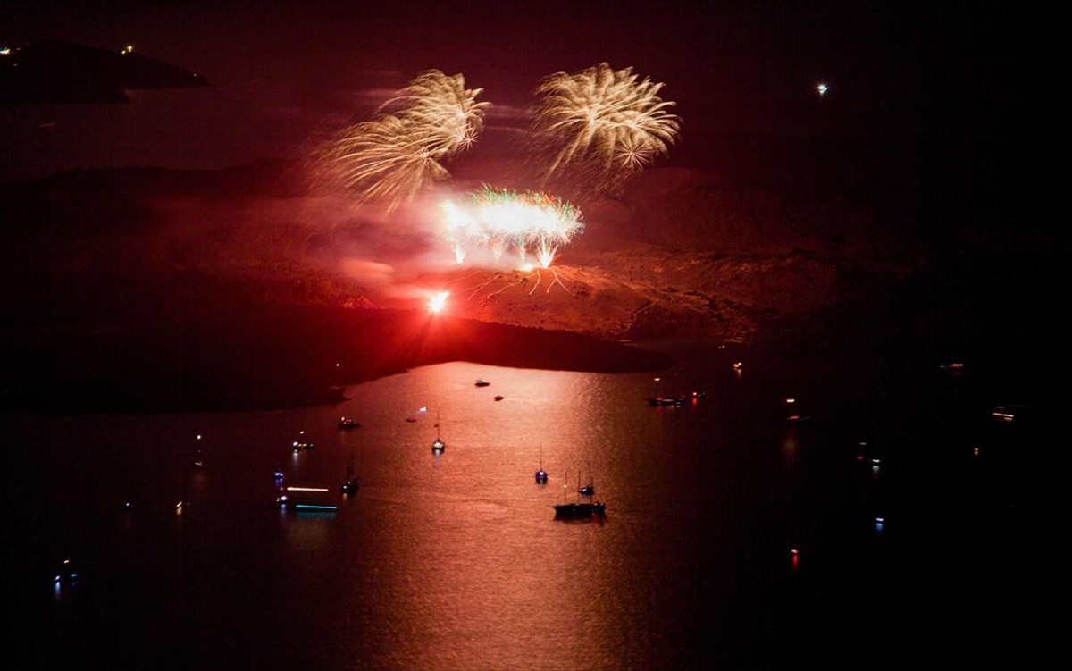 Πυροτεχνήματα, ιδιαίτερες γεύσεις και θέα στο μοναδικό ηλιοβασίλεμα μπροστά στο ηφαίστειο της Σαντορίνης.