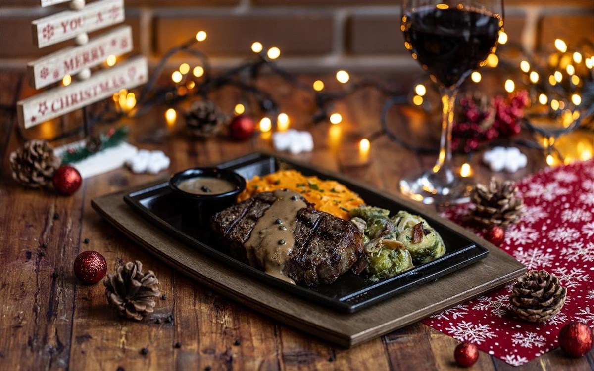 Μην παραλείψετε να δοκιμάσετε το Festive Roasted Turkey με ζουμερό στήθος ψητής γαλοπούλας που περιχύνεται με Port Gravy sauce. Συνοδεύεται με παραδοσιακή γέμιση από κιμά, κάστανα, cranberries, δαμάσκηνα, κουκουνάρι, ρύζι και σπιτικό πουρέ γλυκοπατάτας. Αν θέλετε κάτι ξεχωριστό, το νεοεισερχόμενο Peppercorn Steak με Peppercorn Brandy sauce, ψητά λαχανάκια Βρυξελλών και συνοδευτικό επιλογής, Cheddar Cheese Mashed Potatoes ή Sweet Mashed Potatoes θα σας αποζημιώσει.