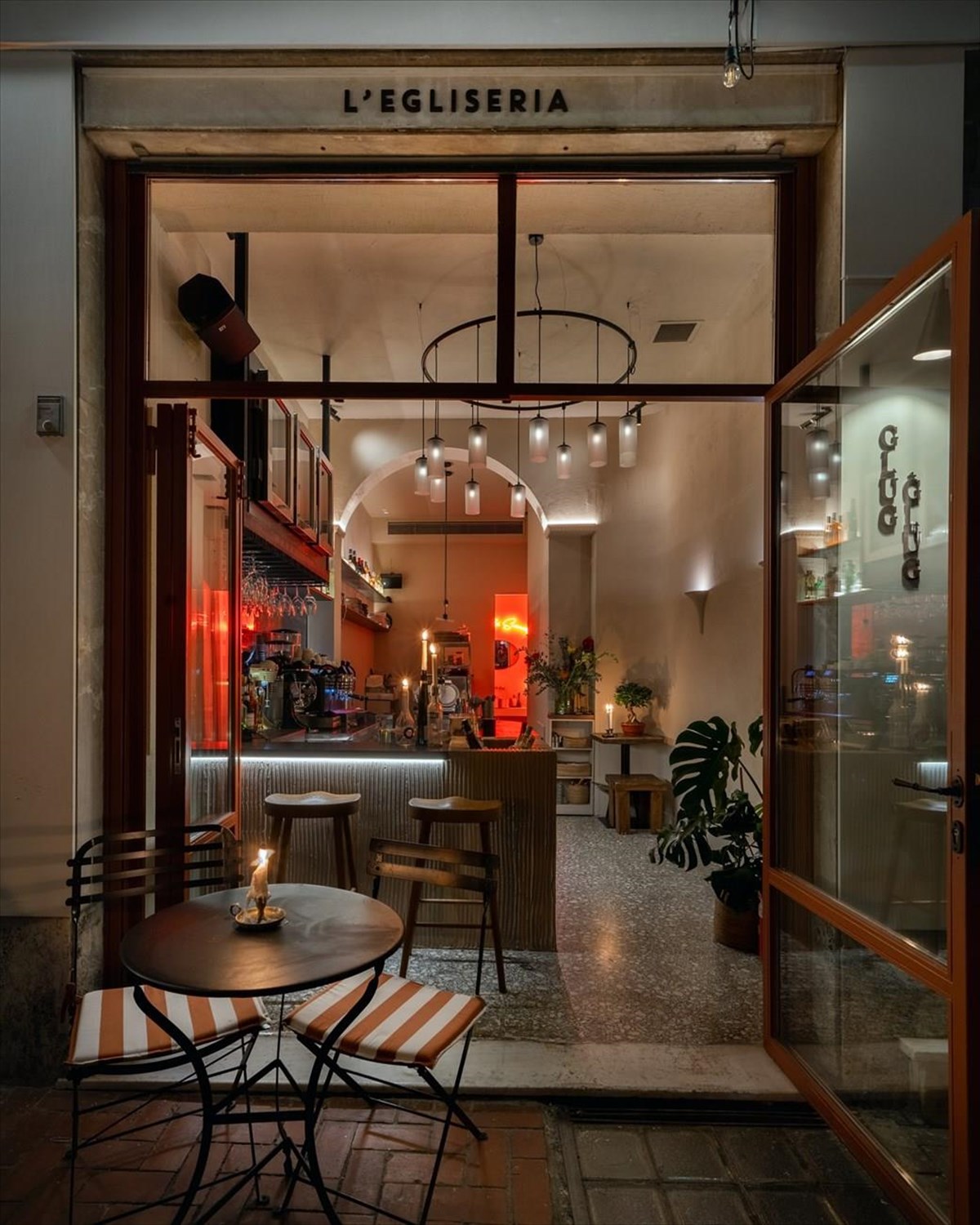 Η θέα στην εκκλησία του Αγίου Γεωργίου του δεν μπορούσε να μην επηρεάσει στο concept του μαγαζιού, το οποίο προσδιορίζεται και ως «L’Egliseria» και δημιουργεί μια ιδιαίτερη ατμόσφαιρα με κεριά μέσα σε μπουκάλια, ιδιαίτερα φωτιστικά και κηροπήγιαμ που θυμίζουν εκκλησία και ένα concept «αγίων και αμαρτωλών» που κυριαρχεί από τα κοκτέιλ μέχρι τις… τουαλέτες.