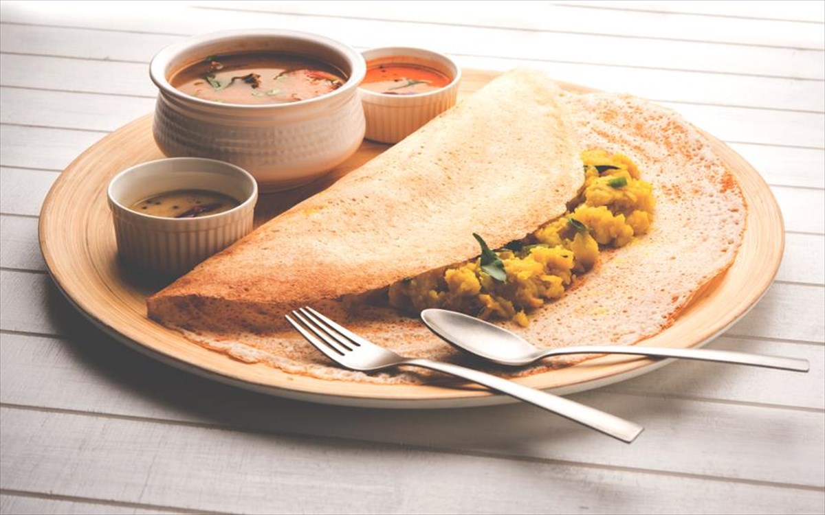 Ένα άλλο αγαπημένο vegan πιάτο είναι το masala dosa, ένα τραγανό πιάτο που μοιάζει με κρέπα και φτιάχνεται από ρύζι που έχει υποστεί ζύμωση και από φακές με γέμιση από πατάτα με μπαχαρικά.