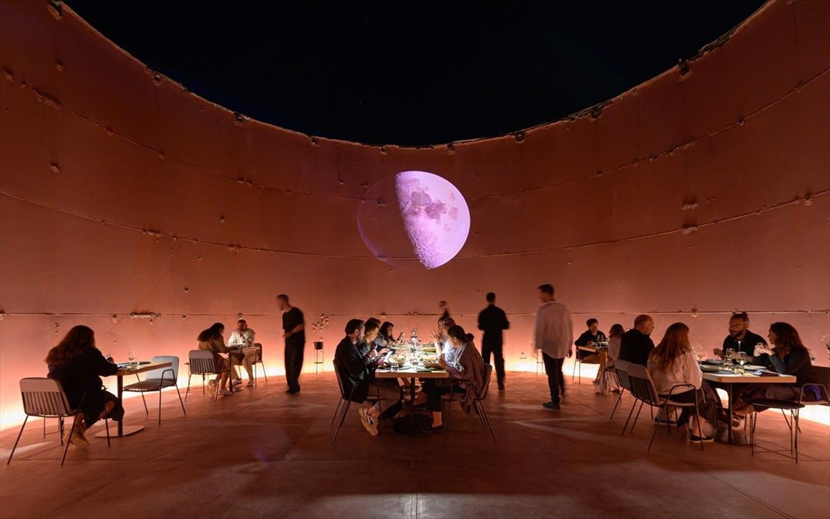dex.Silo.01, αποτέλεσε το μαγικό setting για το δείπνο του A sea Between Us (και θα συνεχίσει να αποτελεί γαστρονομική πλατφόρμα για fine dining εμπειρίες μέχρι τον Σεπτέμβριο). Ένα pop-up fine dining spot, ανοιχτό για να βλέπουμε τα αστέρια και με projection της σελήνης να γεμίζει σταδιακά (full moon-no moon concept), μας υποδέχτηκε για το δείπνο, το οποίο αυτή τη φορά εμπνεύστηκε ο