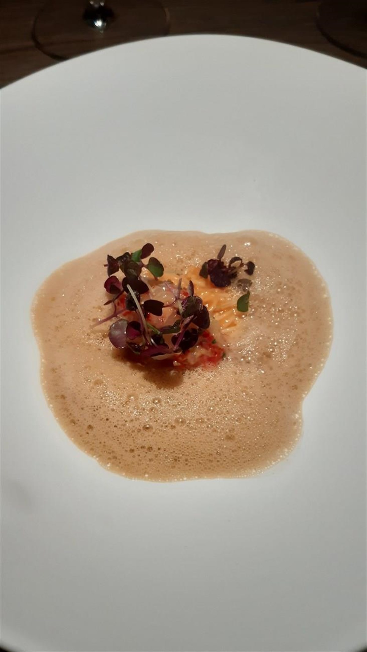 γουρουνοπούλα δεν γίνεται, γι’ αυτό κι εδώ ήρθε σερβιρισμένη μπαλοτίνα με πουρέ αρακά και σάλτσα από σαλάμι αέρος με πούδρα από τη φλούδα του αρακά σε μια zero waste προσπάθεια, με μια Verdea (Κτήμα Γράμψα) για να ολοκληρώσει το γεύμα, πριν το επιδόρπιο που ήταν
