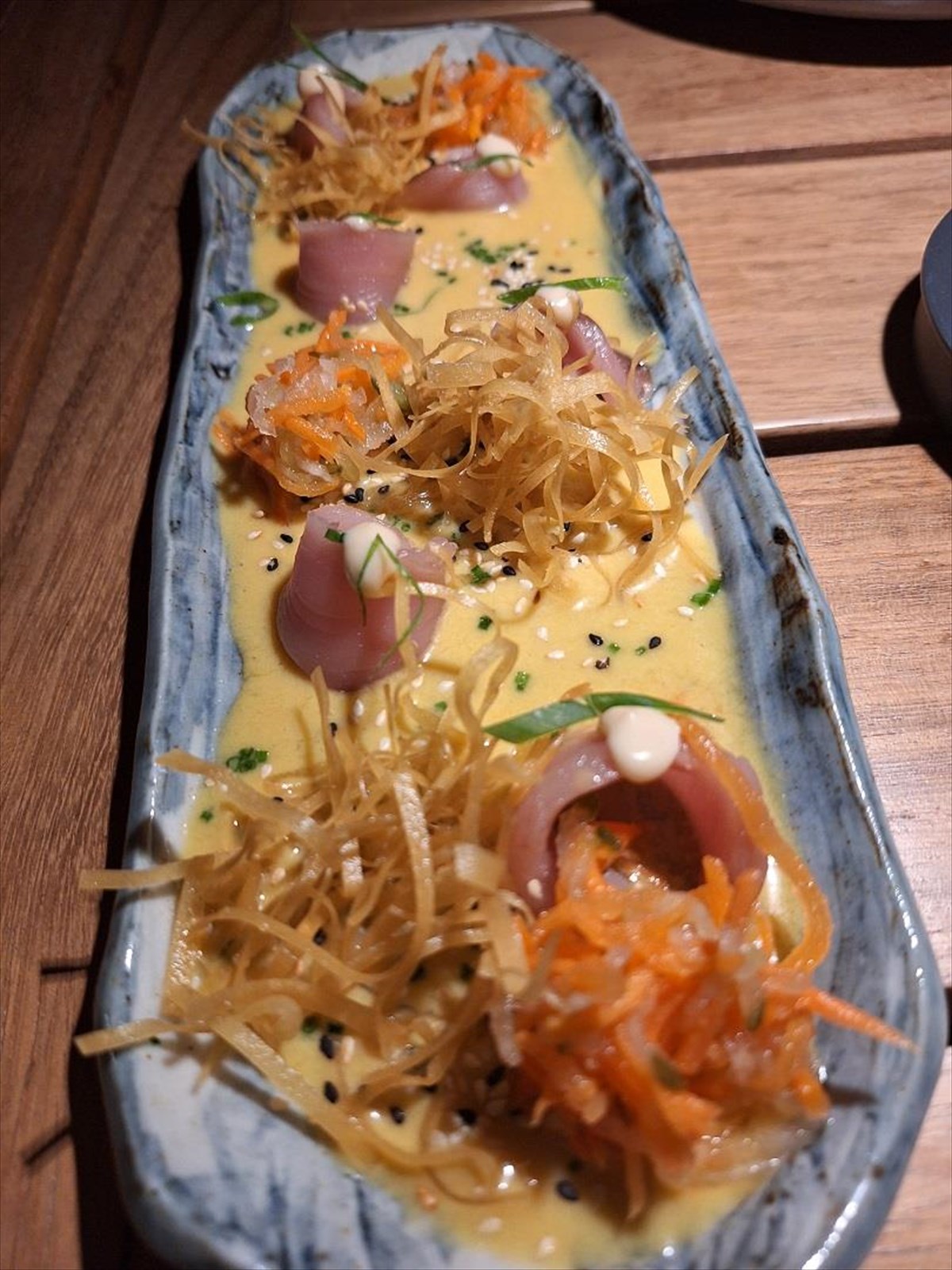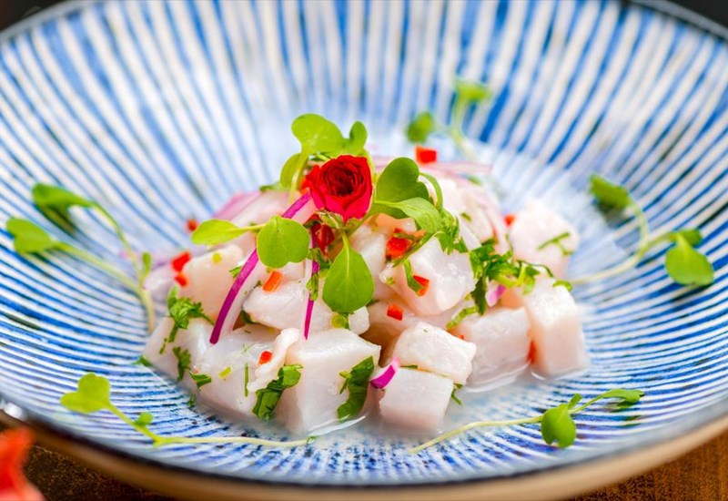 tiradito λαβράκι –πιάτο που «παντρεύει» υπέροχα το περουβιανό σεβίτσε με το γιαπωνέζικο sashimi- με μαγιονέζα dashi (ζωμός που αποτελεί βάση πολλών πιάτων στην ιαπωνική κουζίνα), λαχανικά τουρσί, σουσάμι, τηγανητό wonton (είδος κινέζικου dumpling) και leche passion fruit έφερε Περού, Κίνα και Ιαπωνία σε μια μπουκιά φρεσκάδας.