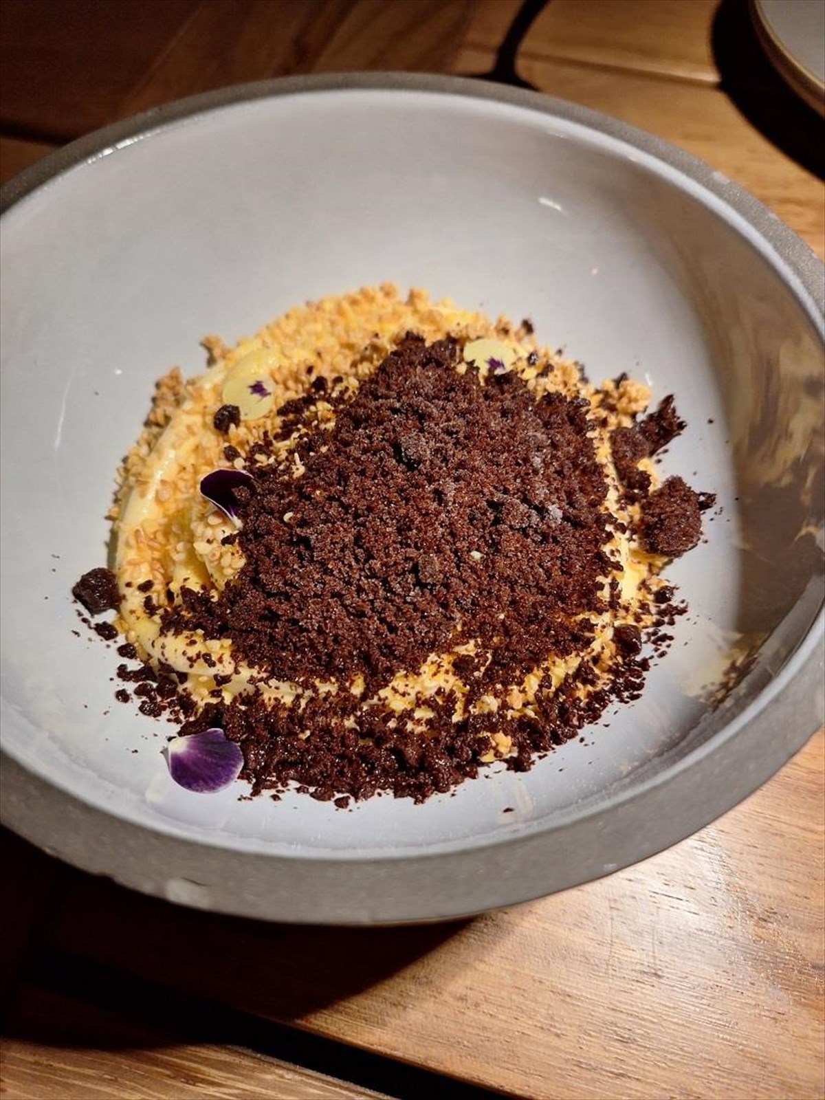 περουβιανή σοκολάτα με 70% αφρό σοκολάτας, ganache με περουβιανή πιπεριά aji Amarillo, κακάο και καραμελωμένο σουσάμι είναι ο παράδεισος κάθε σοκολατόπληκτου εκεί έξω και σίγουρα στις must try επιλογές. Για να καθαρίσει η παλέτα, το