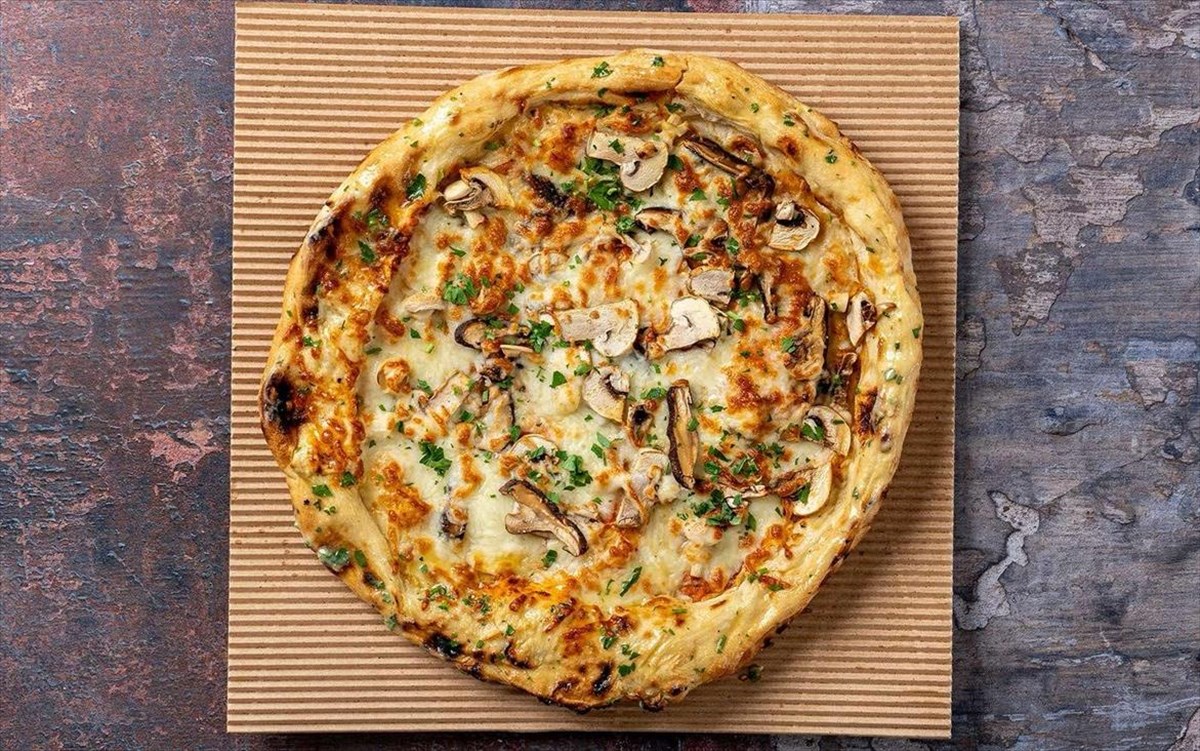 Μια vegan-friendly επιλογή με λευκή σάλτσα, μανιτάρια, τριμμένη μοτσαρέλα, αρωματικό βούτυρο και φρέσκο κόλιανδρο.