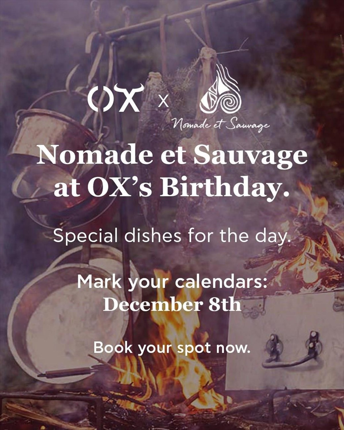 Την Κυριακή 8/12, λοιπόν, το OX Athens οι ταλαντούχοι Nomade et Sauvage θα φέρουν την αυθεντική, υπαίθρια γαστρονομία τους στο OX, παρουσιάζοντας ειδικά πιάτα που θα δημιουργηθούν αποκλειστικά για την ημέρα. Η γιορτή αυτή θα συνδυάσει την υψηλή αισθητική του OX με τη φιλοσοφία των Nomade et Sauvage, προσφέροντας ένα ταξίδι γεύσεων εμπνευσμένο από τη φύση και τη φωτιά. Αυτό φυσικά μεταφράζεται σε αυθεντικές γεύσεις με τοπικά προϊόντα, ζωντανή προετοιμασία πιάτων και τμόσφαιρα απόλυτα εναρμονισμένη με τη φιλοσοφία του Nomade et Sauvage.