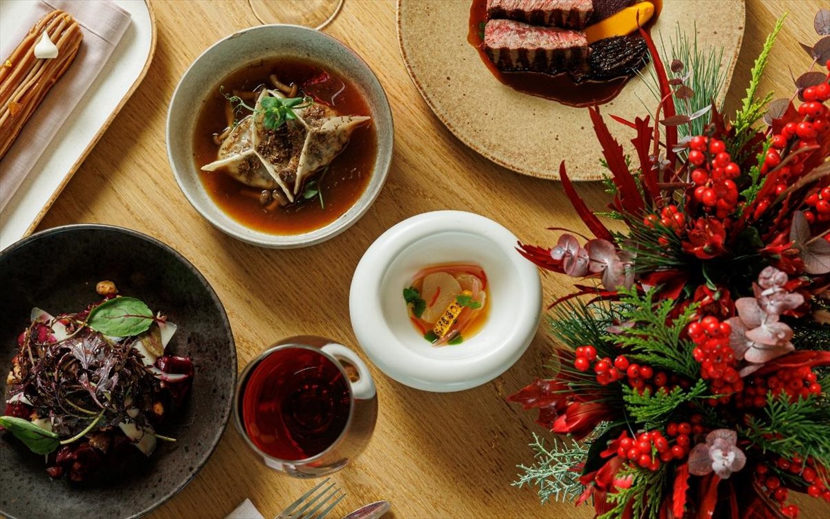 Η ομάδα του δημοφιλούς all-day restaurant MFlavours, με επικεφαλής τον Executive Chef Δημήτρη Μπούτσαλη, τον Chef de Cuisine Δημήτρη Αρσενίδη και την Pastry Chef Κωνσταντίνα Μακρυγιάννη, έχει δημιουργήσει ακόμα μια φορά τέσσερις εξαιρετικά επιμελημένες προτάσεις, που θα συνοδεύσουν τόσο τα δύο βραδινά ρεβεγιόν, όσο και τα εορταστικά μεσημεριανά γεύματα των Χριστουγέννων και της Πρωτοχρονιάς. Το βράδυ της παραμονής των Χριστουγέννων, η γαστρονομική περιπέτεια ξεκινά στο Mappemonde Restaurant Bar & Lounge και στο MFlavours στον 9ο και 10ο όροφο του πολυτελούς ξενοδοχείου, με τρεις προτάσεις ορεκτικών, που συνδυάζουν εύγεστα υλικά αλλά και απροσδόκητους συνδυασμούς που απογειώνουν στο έπακρο την εορταστική ατμόσφαιρα. Περνώντας στο κυρίως πιάτο, μπορείτε να επιλέξετε ανάμεσα σε γαλοπούλα με γέμιση μπέικον, kale, γλυκοπατάτα, κάστανα και σάλτσα cranberry ή μοσχαρίσιο φιλέτο Au Poivre με αγκινάρα Ιερουσαλήμ και κακάο. Την αυλαία κλείνει το κλασσικό Mont Blanc με κάστανο, μήλο και ιβίσκο, αφήνοντας μια πλούσια και αρωματική επίγευση που θα ικανοποιήσει και τους πιο απαιτητικούς (μενού Παραμονής Χριστουγέννων 210 ευρώ/άτομο). Η γιορτινή ατμόσφαιρα συνεχίζεται και την ημέρα των Χριστουγέννων με το Christmas Lunch του Mappemonde (120 ευρώ/άτομο), όπου η ποικιλία αποτελεί το βασικό χαρακτηριστικό της εμπειρίας. Η υποδοχή γίνεται με επτά διαφορετικά ορεκτικά πιάτα, με τη σούπα κολοκύθας-κάστανου και μαύρης τρούφας να κλέβει τις εντυπώσεις. Το μενού ξεκινά επίσημα με τέσσερις επιλογές κυρίως πιάτων για όλα τα γούστα, μεταξύ των οποίων γλασαρισμένος σολομός σε miso, γεμιστή γαλοπούλα, μοσχαρίσιο φιλέτο Au Poivre ή μία εξαιρετική επιλογή για vegan με ψητή κολοκύθα. Το γεύμα ολοκληρώνεται με δυο επιδόρπια, Choux με αλμυρή καραμέλα, τόνκα, βανίλια και σοκολάτα και κορμό με φυστίκι Αιγίνης, βύσσινο και κανέλα. Και για την πιο εορταστική βραδιά του χρόνου, την Παραμονή της Πρωτοχρονιάς, το Mappemonde Restaurant Bar & Lounge (360 ευρώ/άτομο) και το MFlavours (300 ευρώ/άτομο) μας προσκαλούν σε ένα ακόμα γαστρονομικό ταξίδι με θέα τη στολισμένη και λαμπερή Αθήνα. Το μενού ανοίγει με το ιδιαίτερο μοσχαρίσιο κονσομέ "Madrilène" με φουά γκρα και τρούφα, ενώ στο δεύτερο πιάτο το κόκκινο βασιλικό καβούρι με χαβιάρι, αβοκάντο και χειμωνιάτικη σαλάτα προσδίδει μια δροσερή πινελιά, ιδανική για να υποδεχθεί το ραβιόλι με χτένι, καραβίδα, καφέ βούτυρο και dashi τρούφας. Στο κυρίως πιάτο, οι επιλογές περιλαμβάνουν ψητό καλκάνι με σπαράγγια, κουκουναρόσπορο, όστρακα, χαβιάρι και λάδι κάρδαμου ή μοσχαρίσιο φιλέτο Wagyu με τάρτα λαχανικών με ρίζες, béarnaise παντζαριού και αφρό πατάτας-χρένου. Στην εκπνοή της αλλαγής του χρόνου, η γαστριμαργική εμπειρία φτάνει στο απόγειό της, με μια διαφορετική και ταυτόχρονα γιορτινή εκδοχή της κλασσικής μους σοκολάτας με την προσθήκη του λεμονόχορτου και πραλίνας κουκουνάρι. Και φυσικά, η αρχή του νέου έτους δε θα μπορούσε να ξεκινήσει διαφορετικά, παρά με ένα πλούσιο γεύμα στο πιο φημισμένο εστιατόριο της πόλης. Επτά ορεκτικά θα αποτελέσουν την έναρξη του απόλυτου πρωτοχρονιάτικου γεύματος μεταξύ των οποίων, ποικιλία από sushi & sashimi, σούπα βελουτέ με αγκινάρα Ιερουσαλήμ και μασκαρπόνε με κρέμα τρούφας, ποικιλία από σαλάτες και φυσικά πλούσια είδη τυριών και αλλαντικών. Στη συνέχεια, οι επιλογές του κυρίως πιάτου εκτείνονται από σφυρίδα με χόρτα, κάστανα και μανιτάρια, ψητό στήθος κοτόπουλο με κολοκύθα και τρούφα, Black Angus beef Rib eye με σπαράγγια σχάρας και πο