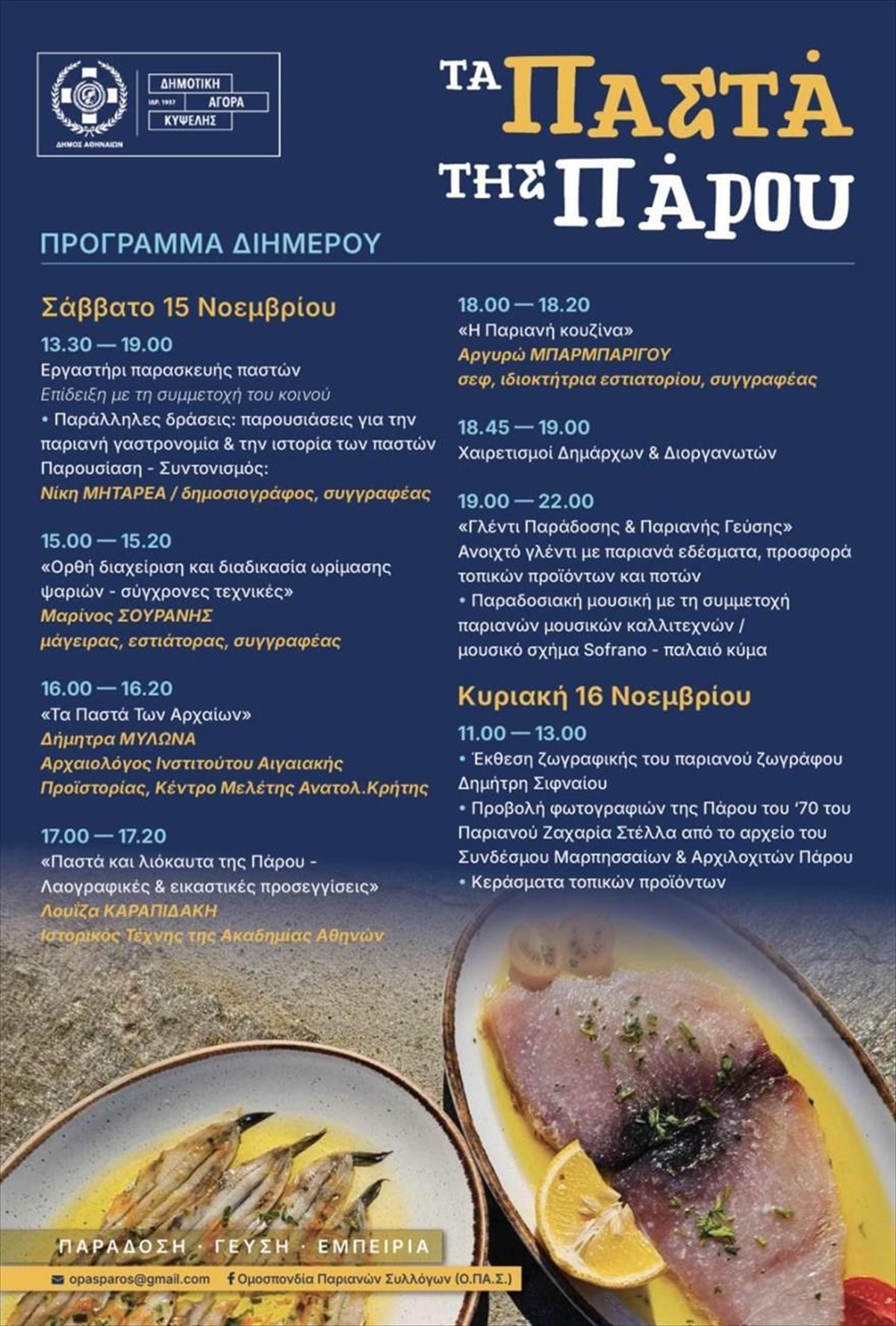 Ένα διήμερο γεμάτο παράδοση, γεύση και εμπειρία ετοιμαζόμαστε να ζήσουμε στις 15 και 16 Νοεμβρίου στη Δημοτική Αγορά Κυψέλης, καθώς η Πάρος και τα παστά της ταξιδεύουν προς το κέντρο της πόλης. Η εκδήλωση «Τα Παστά της Πάρου», που διοργανώνεται από την Ομοσπονδία Παριανών Συλλόγων (Ο.ΠΑ.Σ.) και τον ΝΑΪΑΣ (Ναυτικό Όμιλο Νάουσας Πάρου) σε συνδιοργάνωση με τον Δήμου Πάρου, θα φιλοξενηθεί με ελεύθερη είσοδο με στόχο να μας προσκαλέσει σε ένα ταξίδι γεύσης, γνώσης και πολιτισμού, όπου η παράδοση συναντά τη σύγχρονη μαγειρική δημιουργία, με επίκεντρο φυσικά την πλούσια παριανή γαστρονομική παράδοση και ειδικότερα την τέχνη των παστών.