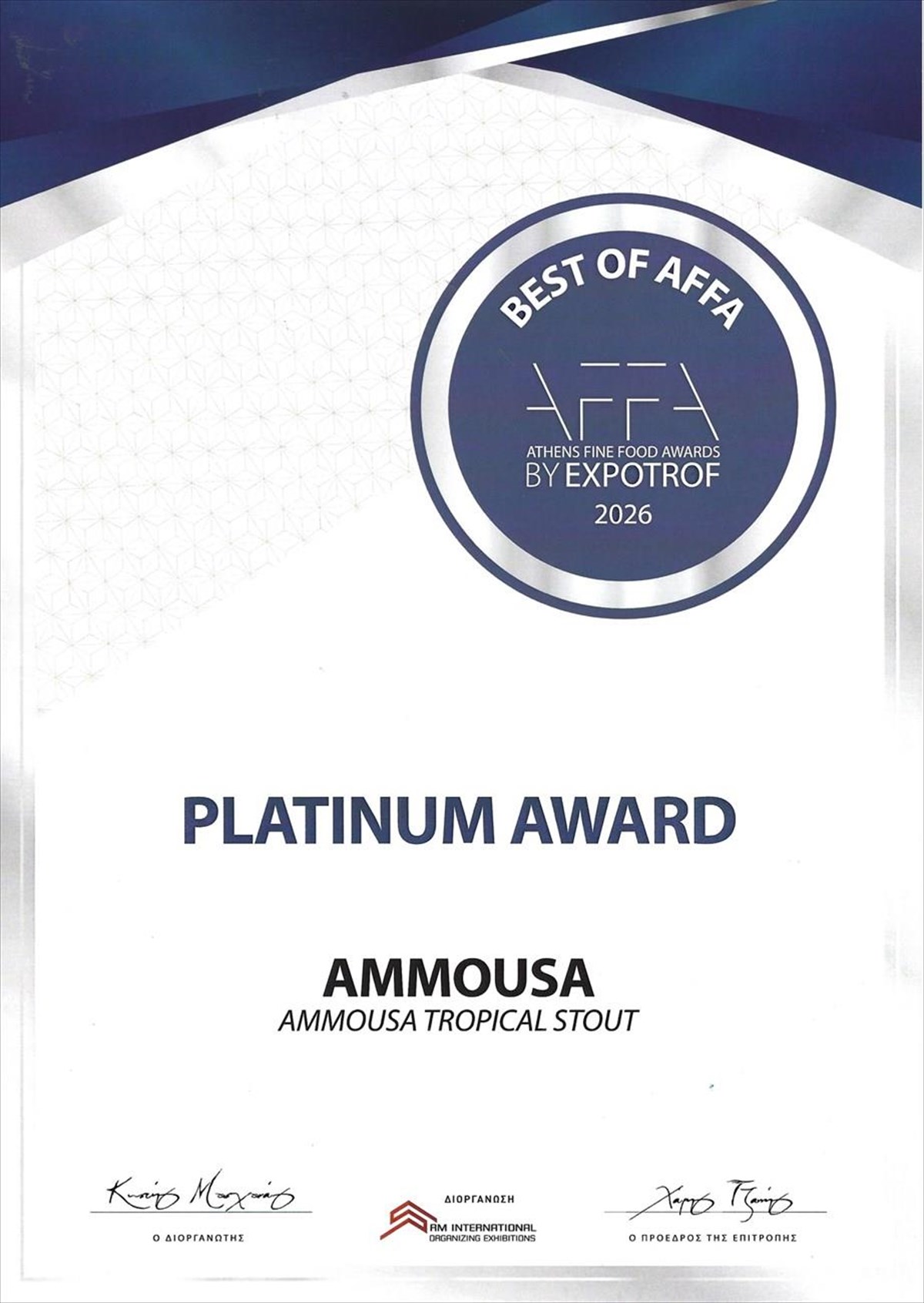 AMMOUSA Tropical Stout: Platinum Award (Κορυφαίο προϊόν της διοργάνωσης)