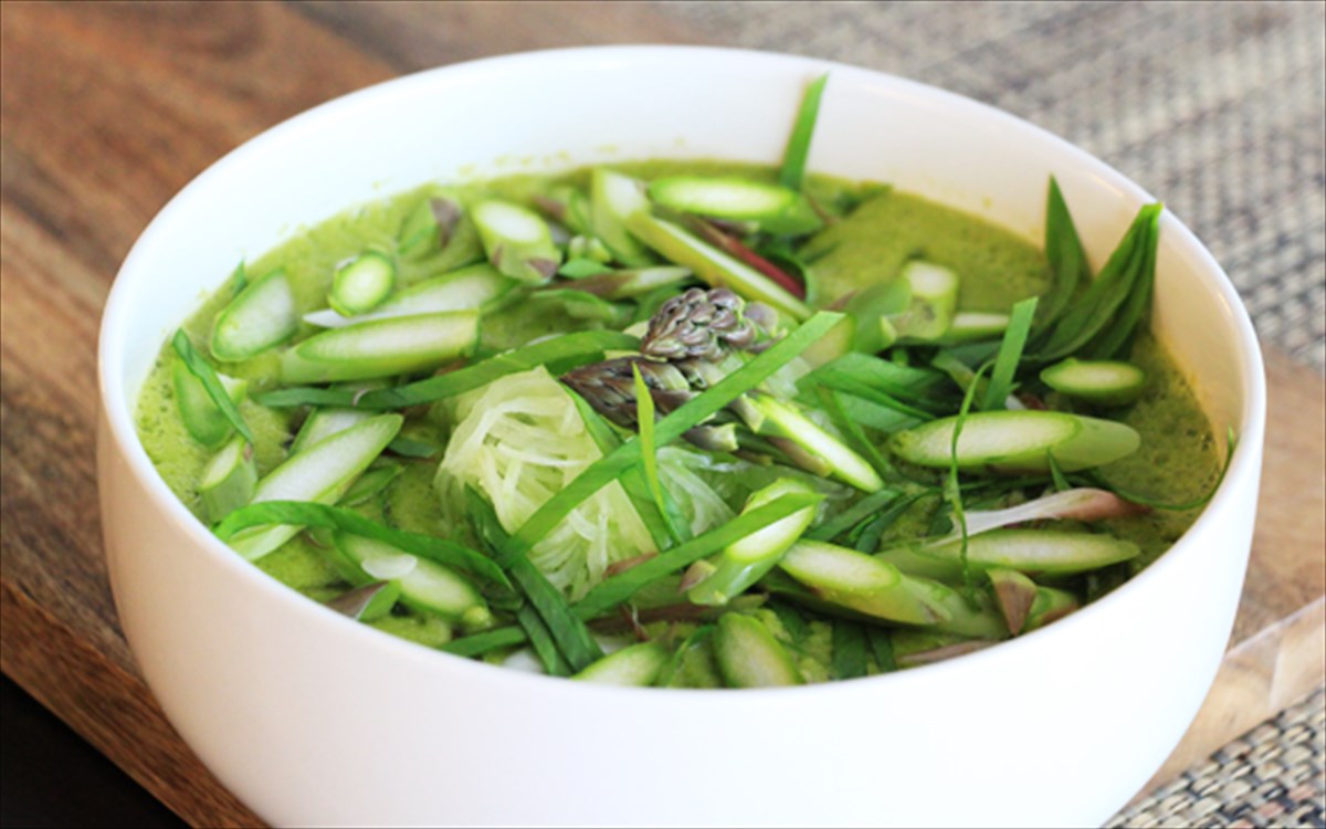 Σούπα από σπαράγγια με αυγά ορτυκιού και χαβιάρι