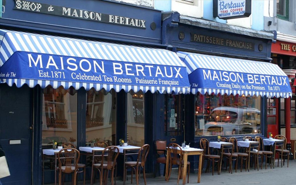 Αυτοί που μαζί με ένα κομμάτι κέικ θέλουν να απολαμβάνουν και ένα κομμάτι σύγχρονης τέχνης, θα ικανοποιηθούν απόλυτα από το παλαιότερο καφενείο του Λονδίνου. Από το 1871, το Maison Bertaux έχει φέρει τη γαλλική ζαχαροπλαστική στην περιοχή του Soho. Είναι κοντά στη σχολή τέχνης του Central St. Martin και μεταξύ άλλων έφτιαξε την τούρτα γάμου της τραγουδίστριας Lily Allen, ενώ η λίστα των πελατών του περιλαμβάνει την Nicole Kidman και τον Bob Geldoff. Η συνιδιοκτήτρια Tania Wade πραγματοποιεί εκθέσεις τέχνης στο υπόγειο της καφετέριας και στον πάνω όροφο στην αίθουσα τσαγιού.