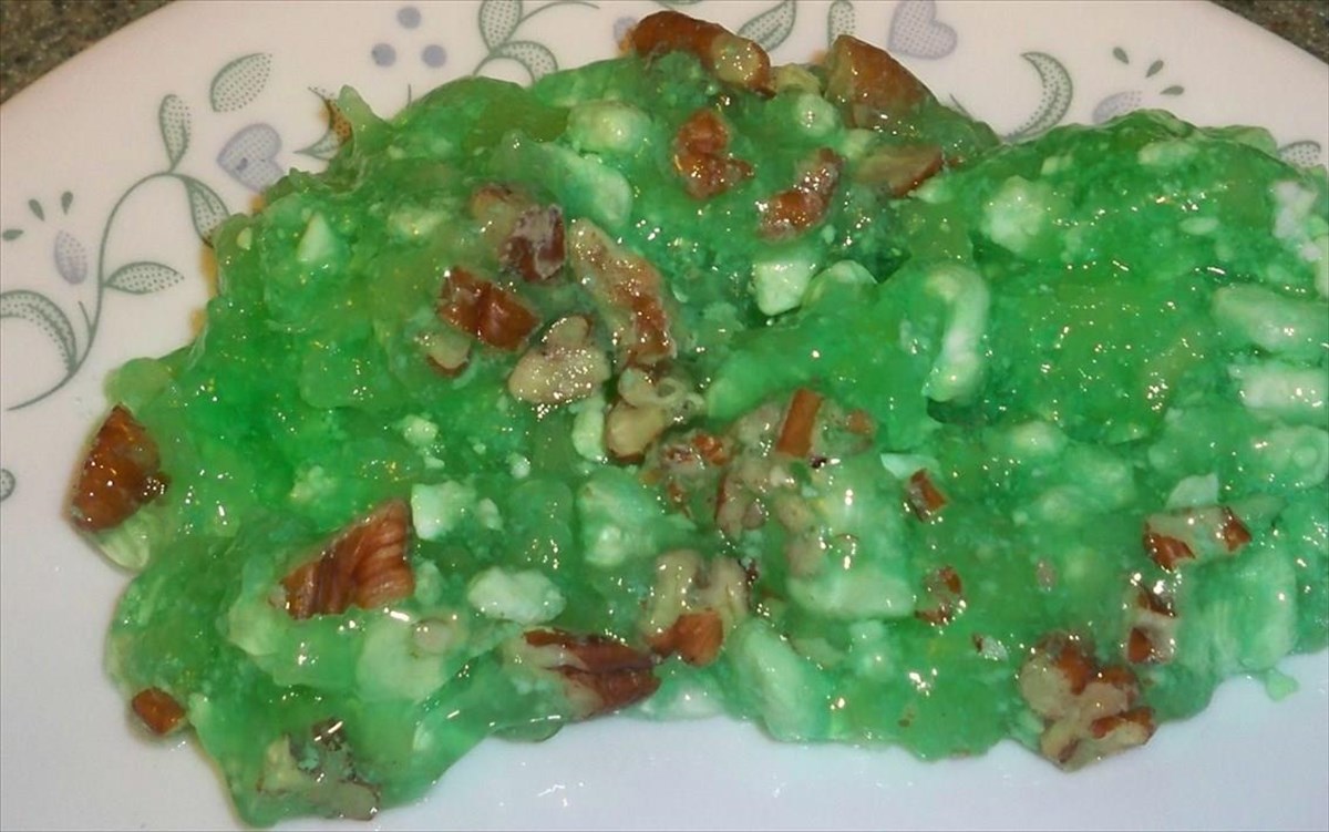 Συνδυασμός που… σκοτώνει, η σαλάτα αυτή αποτελείται από ζελέ lime, αναμεμειγμένο με ξίδι, κρεμμύδι, τυρί κότατζ και μαγιονέζα, στο κέντρο της οποίας βρίσκουμε σαλάτα θαλασσινών, μοιάζοντας με πιάτο που έφτιαξε μικρό παιδί κι έβαλε μέσα ό,τι βρήκε μπροστά του.